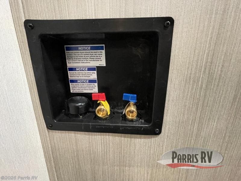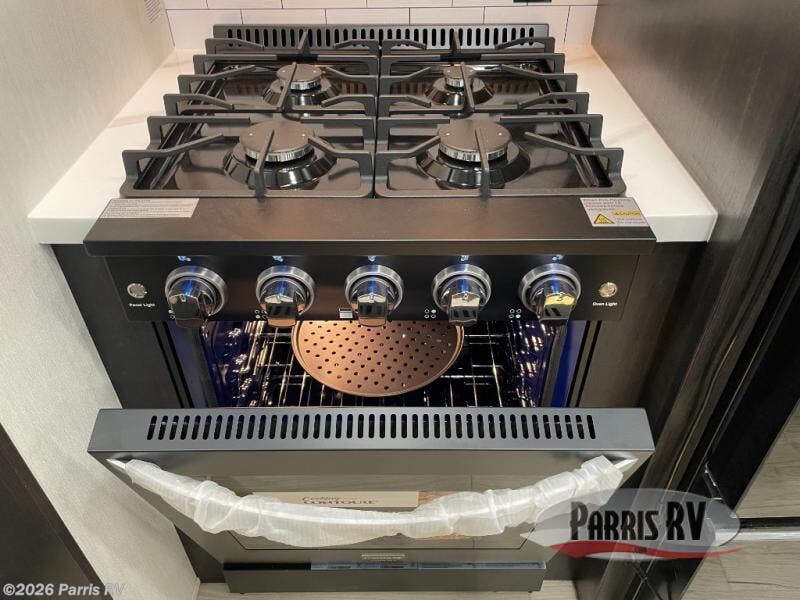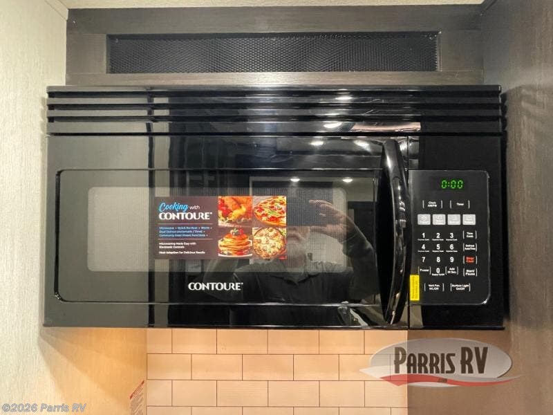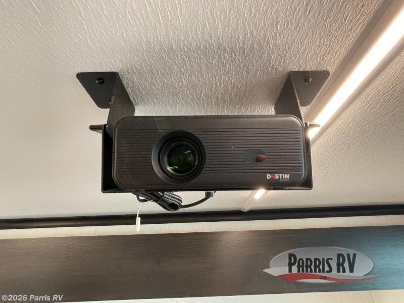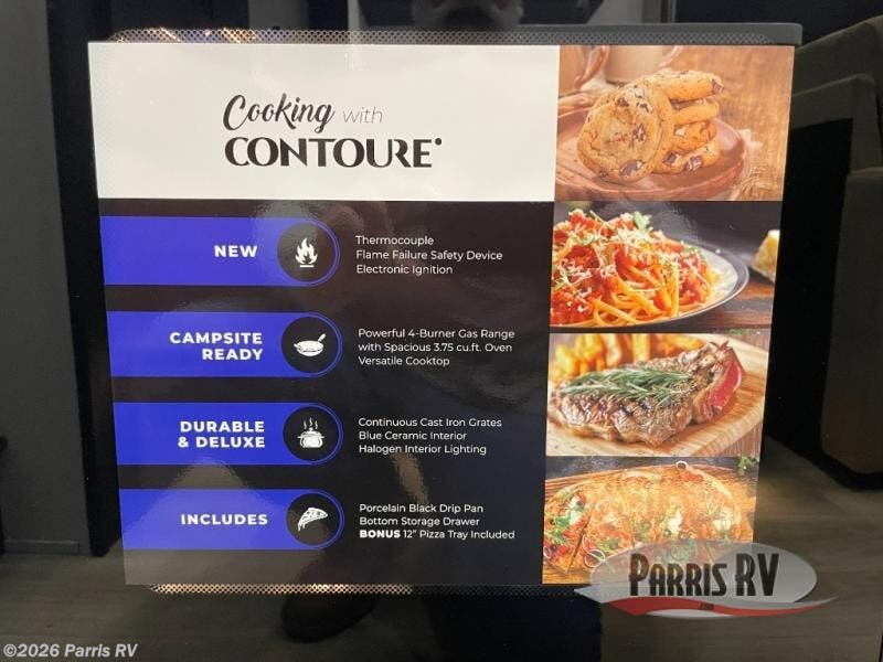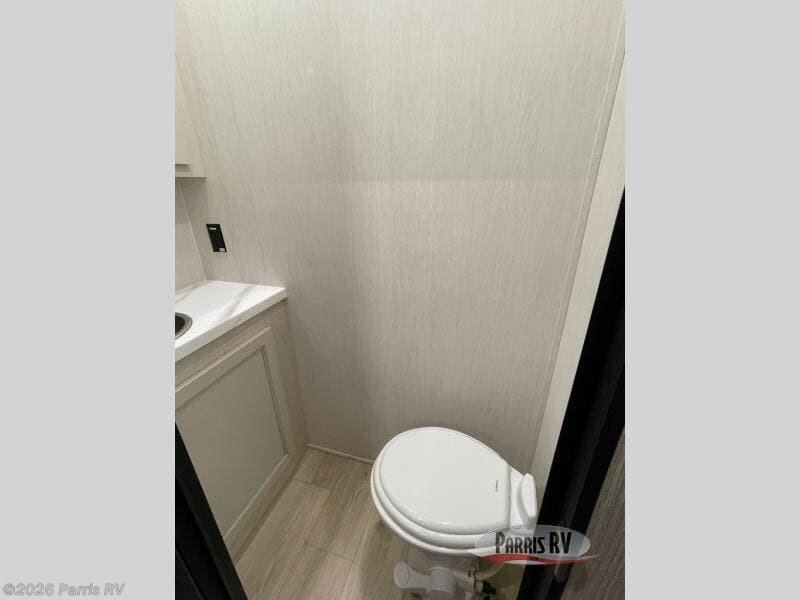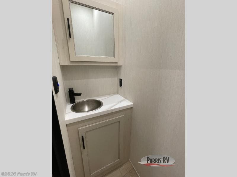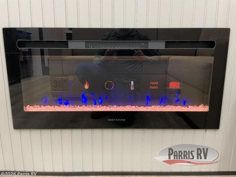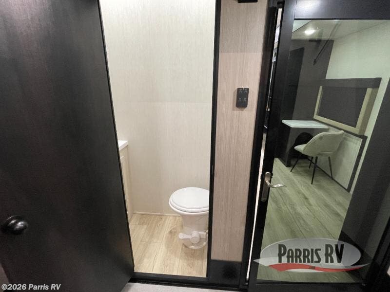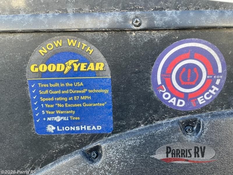 Make each adventure count in this spacious toy hauler for eight! Once you've unloaded the toys from the 13' separate garage, you can utilize the two flip-up sofas with a queen bed above. There is also a half bath here and a ladder leading to the loft! The main living area includes an L-shaped sofa across from the LED flatscreen TV and fireplace, allowing you to have movie nights, and the full kitchen includes ample counter space to set out snacks. A residential style four-burner range and residential size microwave will let you make meals for your crew every day, and there is a pantry plus 12V refrigerator for food storage. You're sure to appreciate the dual bath sinks in the full bath, and you'll feel right at home in the front private bedroom with a king bed slide, dresser, and front wardrobe.