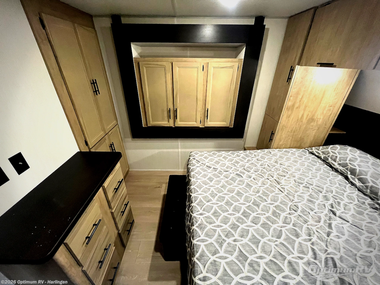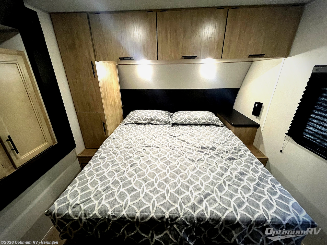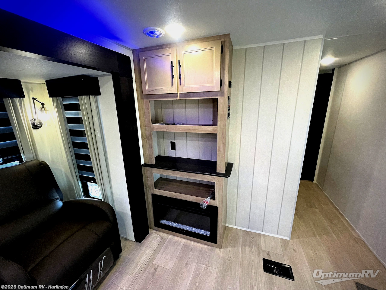 Camping trips to the lake just got sweeter in this spacious travel trailer. You will wake up feeling refreshed each morning after sleeping on the RV king bed. There are is also a bedside wardrobe, plus a dresser and a wardrobe slide out for more space. The linen closet with the option to add a washer and dryer will be another bonus if you plan to go full-time! The chef of your group will love the rear kitchen with a spacious pantry and refrigerator for food storage, plus there is an air fryer to make some crispy chicken. The dinette with bench seating on one side and two chairs on the other will provide a place to dine together, or you can take your plate outdoors to sit under the 15' power awning. The sofa and dual lounge chairs within the living room slide will make you feel right at home, especially with the fireplace close by!