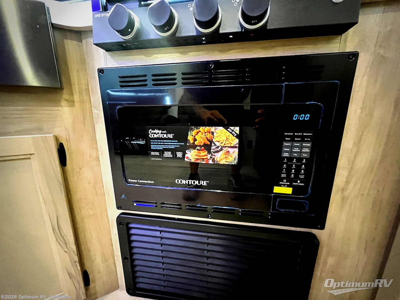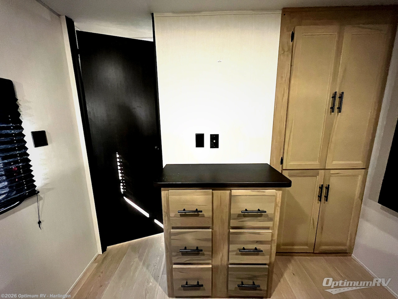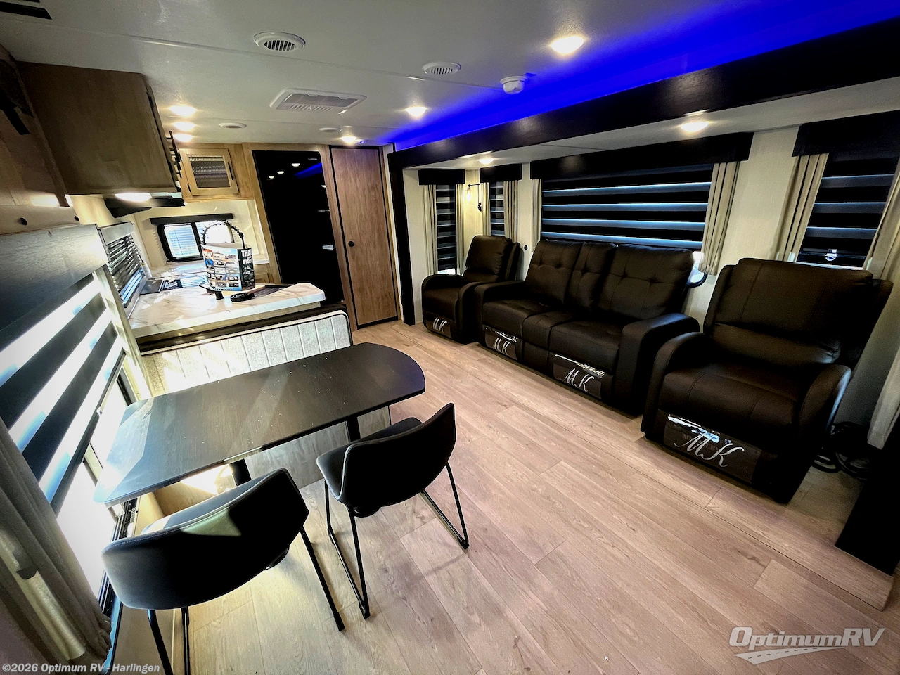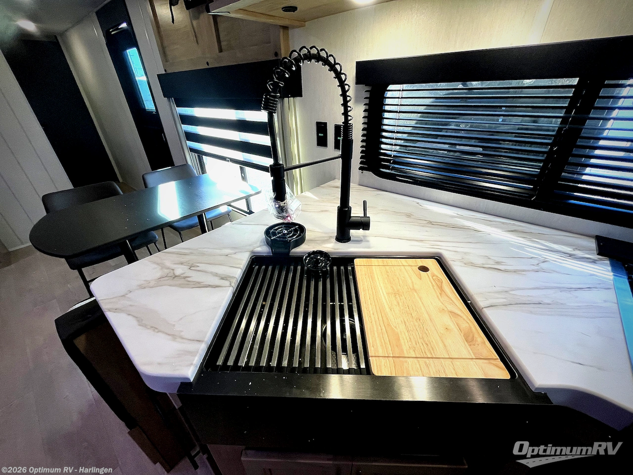 Camping trips to the lake just got sweeter in this spacious travel trailer. You will wake up feeling refreshed each morning after sleeping on the RV king bed. There are is also a bedside wardrobe, plus a dresser and a wardrobe slide out for more space. The linen closet with the option to add a washer and dryer will be another bonus if you plan to go full-time! The chef of your group will love the rear kitchen with a spacious pantry and refrigerator for food storage, plus there is an air fryer to make some crispy chicken. The dinette with bench seating on one side and two chairs on the other will provide a place to dine together, or you can take your plate outdoors to sit under the 15' power awning. The sofa and dual lounge chairs within the living room slide will make you feel right at home, especially with the fireplace close by!