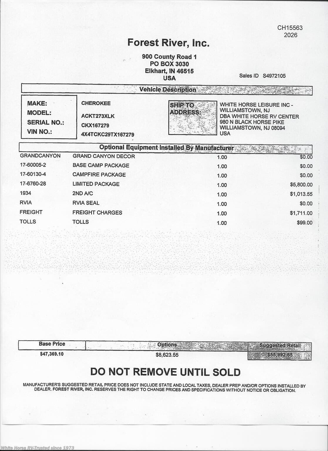 This Forest River Cherokee Wolf Den 273XLK (Stock #CH15563) includes the Base Camp Package, Campfire Package and Limited Package, plus the factory option 2nd AC, with Grand Canyon Interior Décor. MSRP $55,992.65