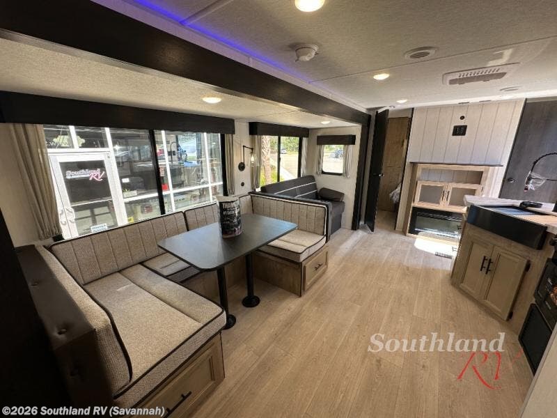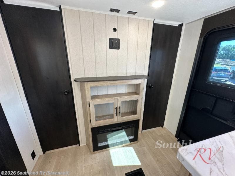 Double slides create spacious living areas in this travel trailer! The chef can prepare their best meals either indoors with the three burner cooktop and air fryer microwave, or at the outdoor kitchen. The kids or guests can sleep in the rear private bunkhouse with a bunk, double bunk, and flip-up bunk above a sofa. The front private bedroom has a walk around RV king bed for a great night's rest plus a wardrobe to keep your things organized. In the morning, everyone can meet in the combined kitchen and living room around the U-shaped dinette and sofa, and the fireplace here will make it feel more like home.