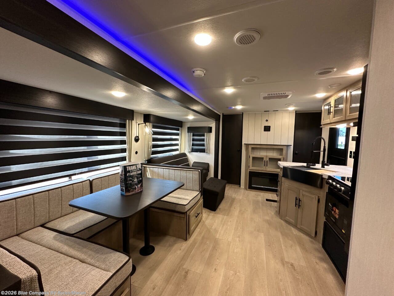 Double slides create spacious living areas in this travel trailer! The chef can prepare their best meals either indoors with the three burner cooktop and air fryer microwave, or at the outdoor kitchen. The kids or guests can sleep in the rear private bunkhouse with a bunk, double bunk, and flip-up bunk above a sofa. The front private bedroom has a walk around RV king bed for a great night's rest plus a wardrobe to keep your things organized. In the morning, everyone can meet in the combined kitchen and living room around the U-shaped dinette and sofa, and the fireplace here will make it feel more like home.