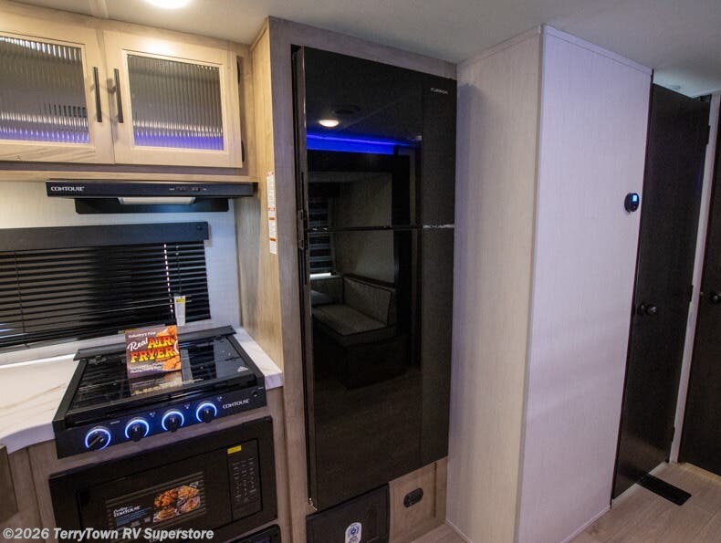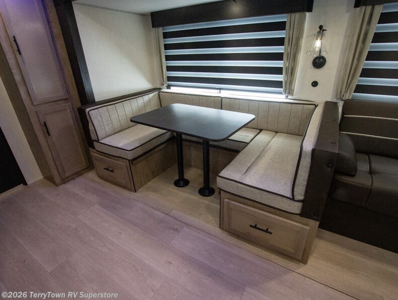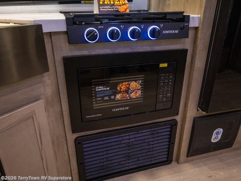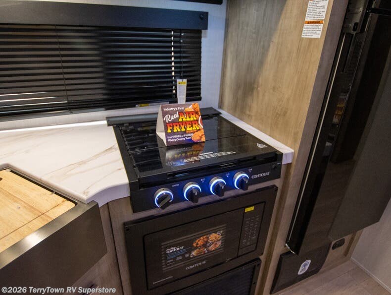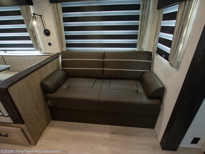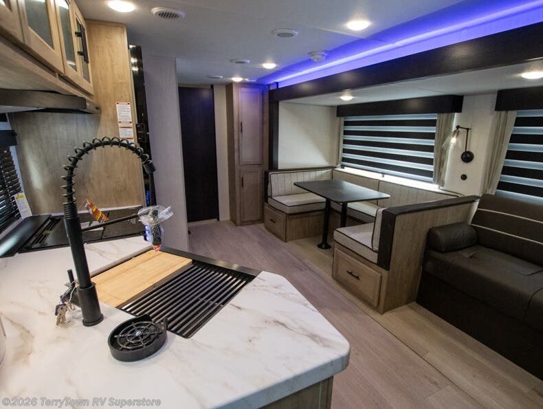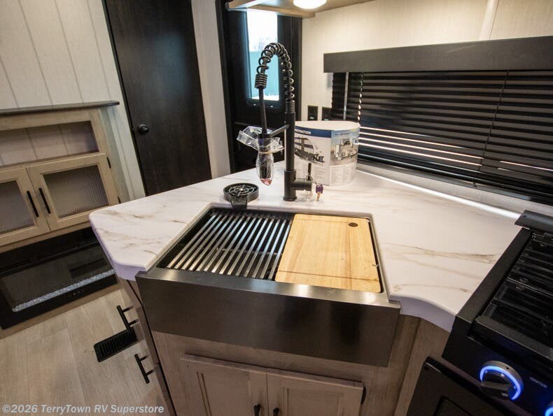 Double slides create spacious living areas in this travel trailer! The chef can prepare their best meals either indoors with the three burner cooktop and air fryer microwave, or at the outdoor kitchen. The kids or guests can sleep in the rear private bunkhouse with a bunk, double bunk, and flip-up bunk above a sofa. The front private bedroom has a walk around RV king bed for a great night's rest plus a wardrobe to keep your things organized. In the morning, everyone can meet in the combined kitchen and living room around the U-shaped dinette and sofa, and the fireplace here will make it feel more like home.
