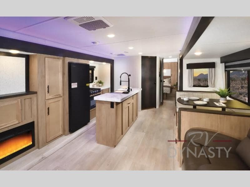 The whole gang will love this travel trailer with triple slides for more space. Your guests or the kids are sure to claim the rear private bunkhouse with a double bunk plus a flip-up bunk above a sofa and a TV mount if you want to add a television here. You'll have the front private bedroom with an RV king bed all to yourselves, and the full bath is close by for easy nighttime use. The middle combined kitchen and living area features dual opposing slides, a kitchen island, plus a U-shaped dinette and sofa. There is also an entertainment center with a fireplace and a hidden pantry behind for movies, snacks and more. Outside, two power awnings, exterior storage, and an outside kitchen makes it easier to spend more time outdoors!