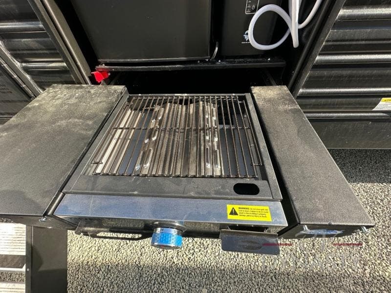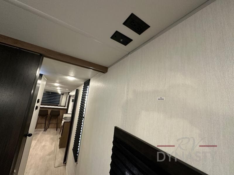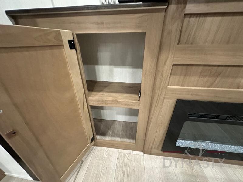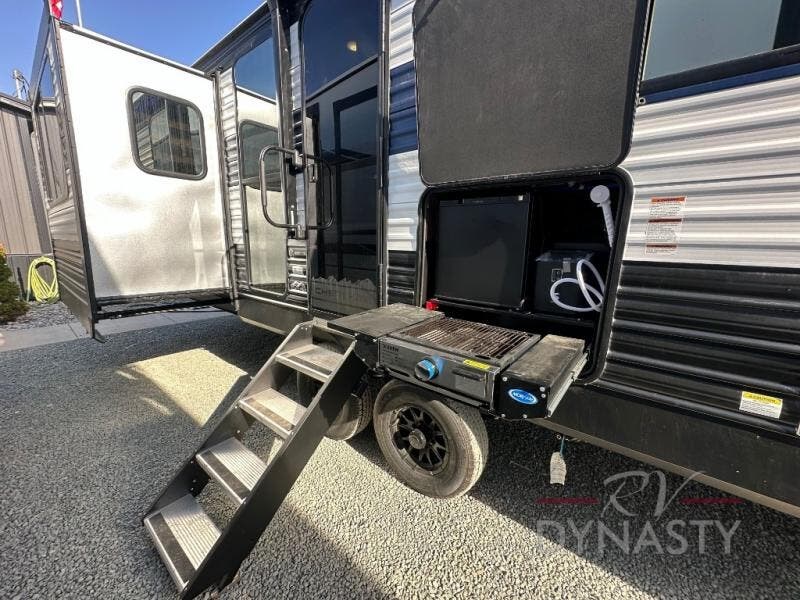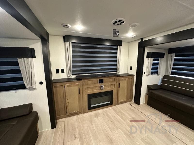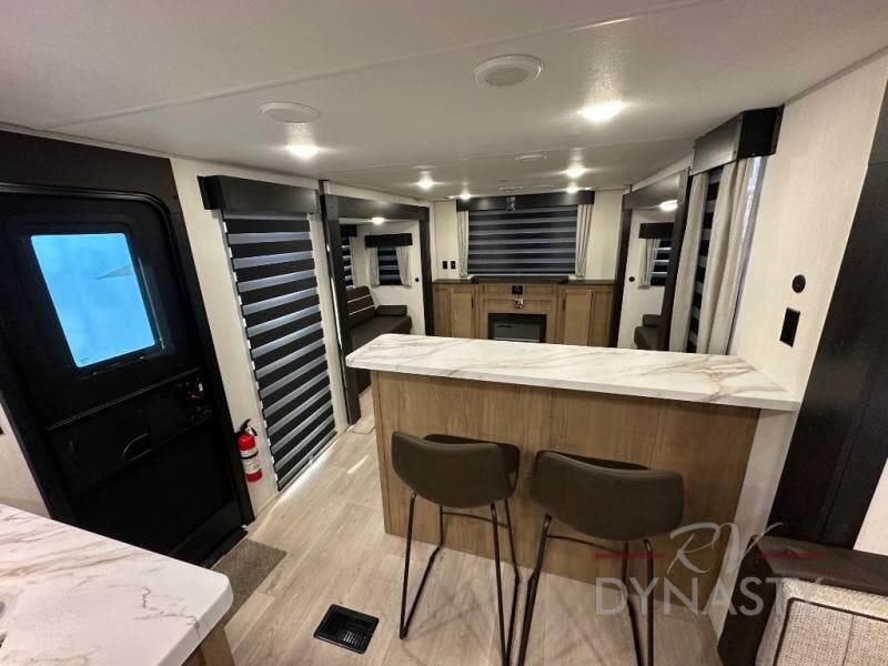 Affordable luxury and livability is what you will find in this travel trailer! The rear living area has opposing sofa slides, two recliners, a rear entertainment center with a fireplace, and a panoramic window for added natural lighting. There is even a bar top with two bar stools overlooking the living area so you can enjoy a meal and a movie. The booth dinette slide has a full door pantry next to it so you can quickly grab a snack during game night. Freshen up each morning in the full bathroom with the shower with a seat. The front private bedroom has a walk around RV king bed for a good night's rest and a linen closet with optional washer and dryer prep. You even have an outside kitchen, a rear storage rack, outside storage areas, and an outside TV mount!