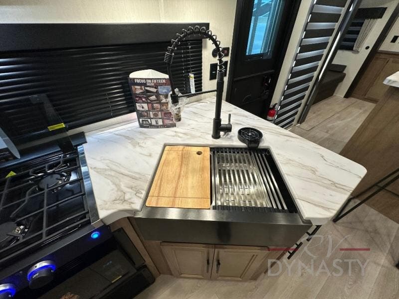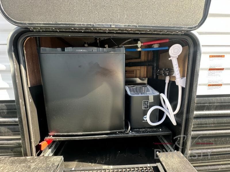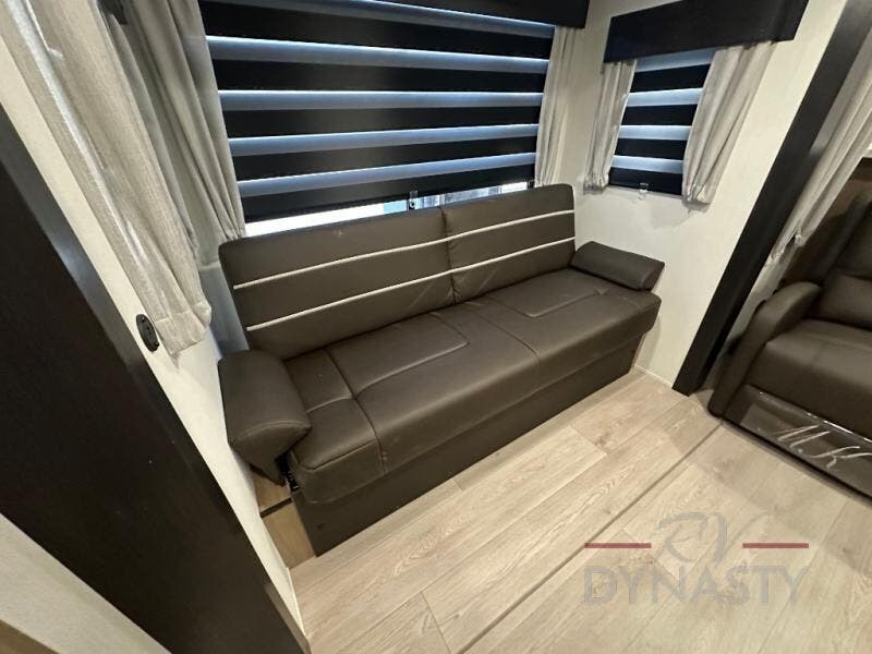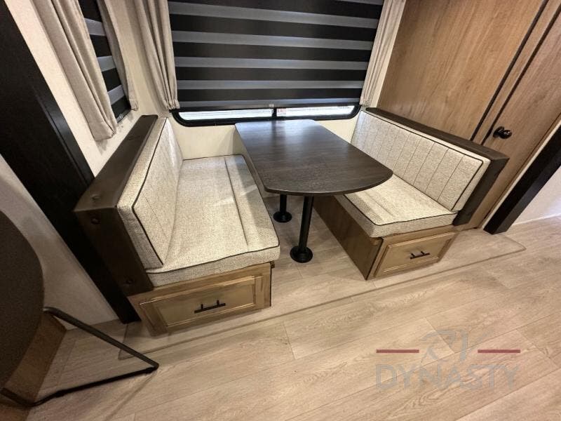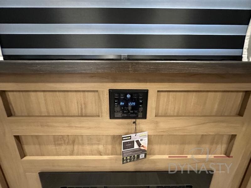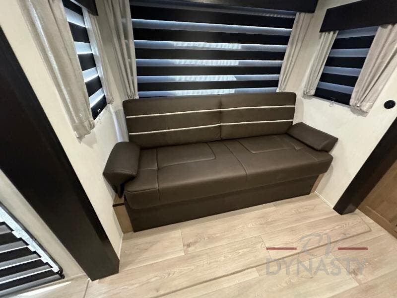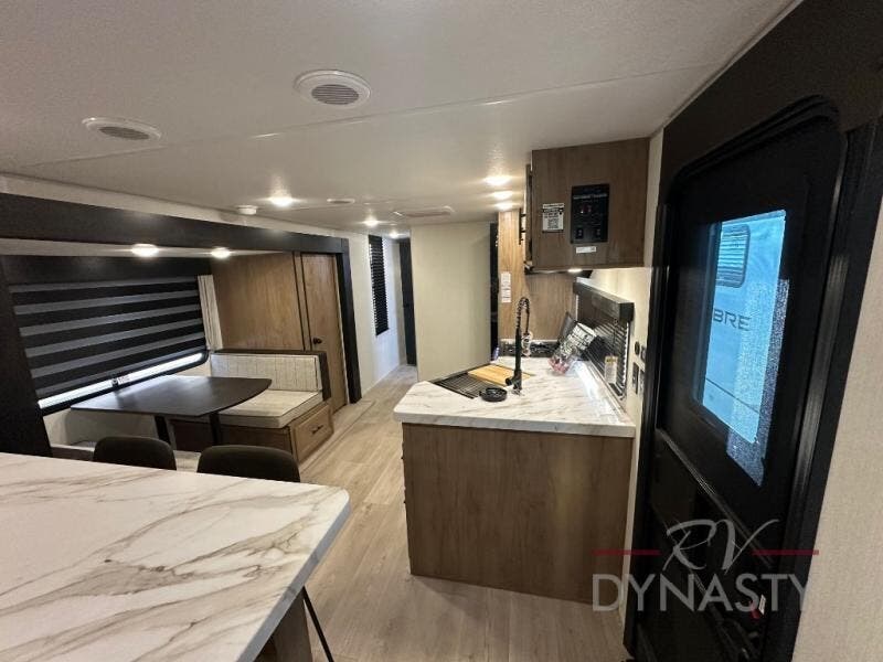 Affordable luxury and livability is what you will find in this travel trailer! The rear living area has opposing sofa slides, two recliners, a rear entertainment center with a fireplace, and a panoramic window for added natural lighting. There is even a bar top with two bar stools overlooking the living area so you can enjoy a meal and a movie. The booth dinette slide has a full door pantry next to it so you can quickly grab a snack during game night. Freshen up each morning in the full bathroom with the shower with a seat. The front private bedroom has a walk around RV king bed for a good night's rest and a linen closet with optional washer and dryer prep. You even have an outside kitchen, a rear storage rack, outside storage areas, and an outside TV mount!