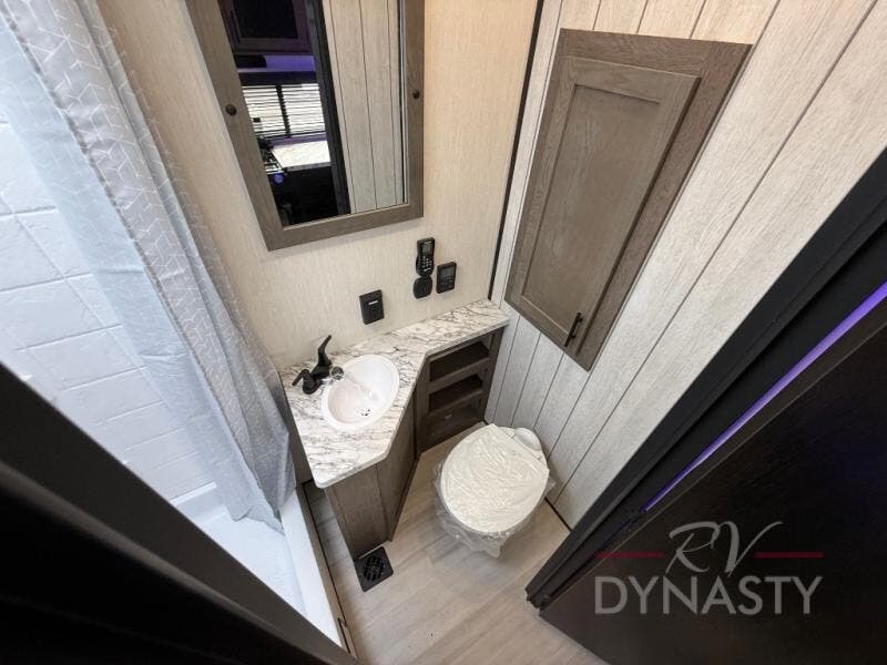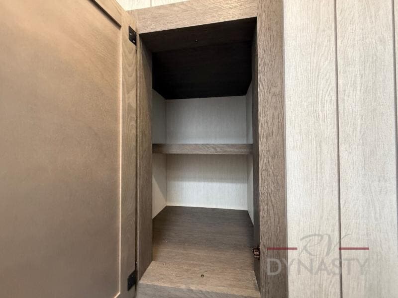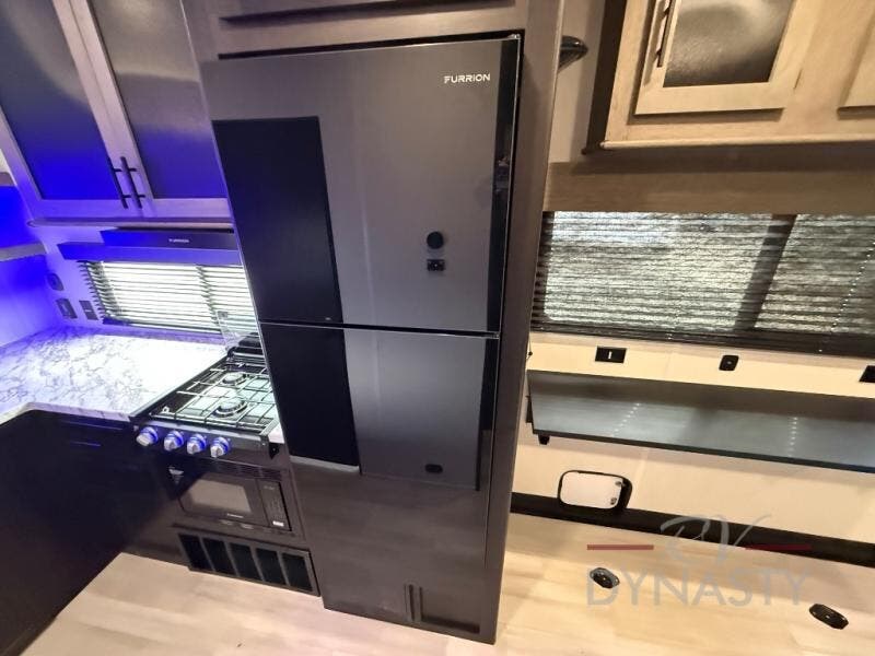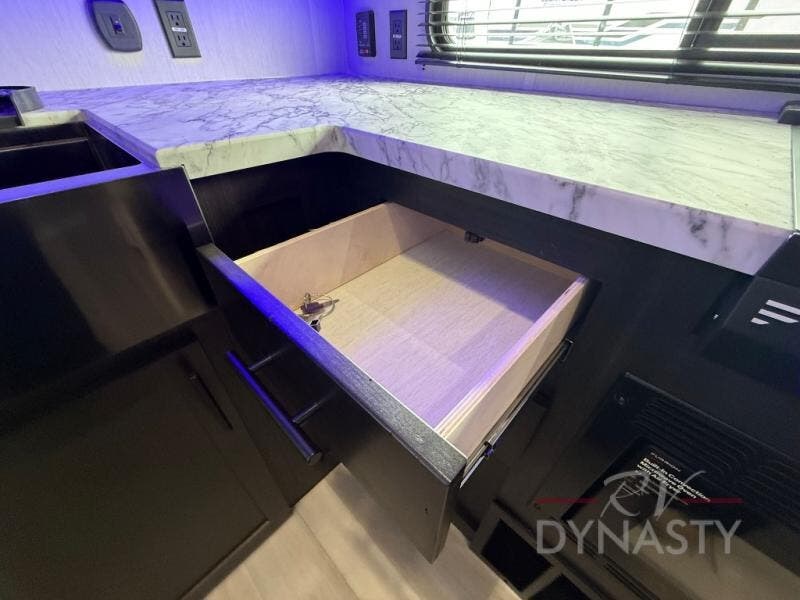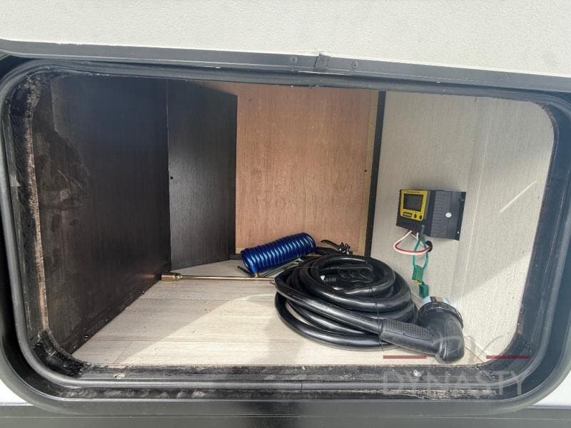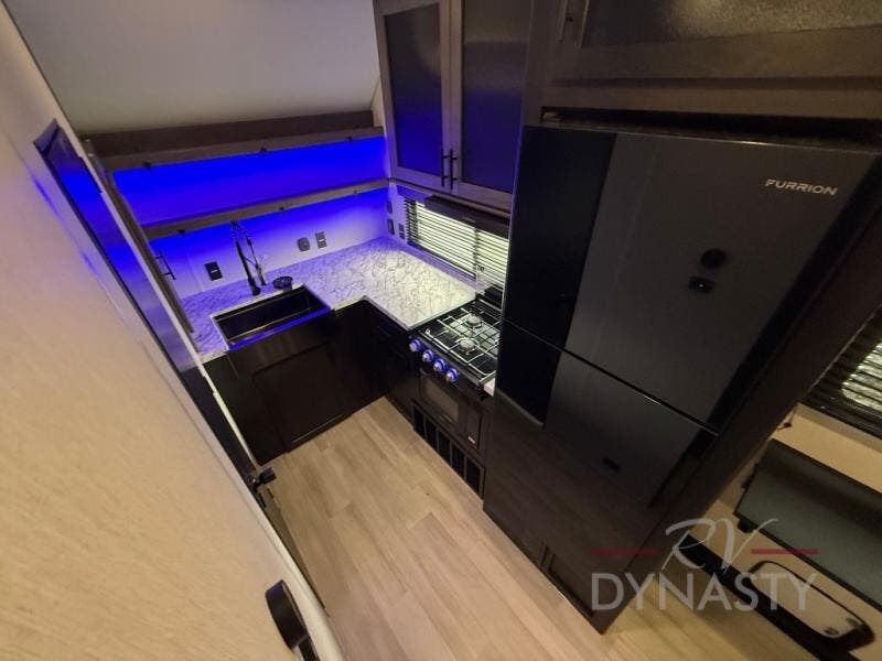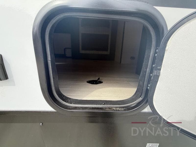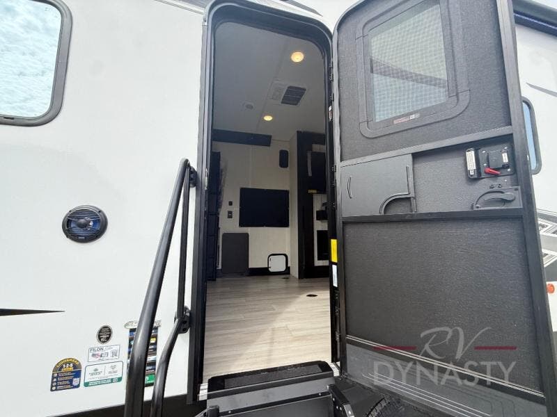 You're going to love camping in this toy hauler with 14' 6" total garage space when you utilize the space up front, which is shared by the kitchen and full bath. The bath linen storage will come in handy for clean towels, and the kitchen pantry will let you keep snacks stocked. You can enjoy your meals at the flip-up countertop with two stools, or head outdoors to sit under the 15' power awning with LED lights. This model also includes a flip-down bed for comfy sleeping space!