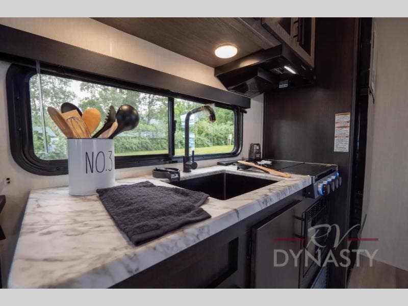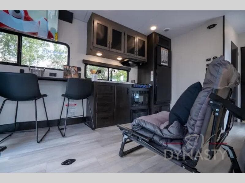 You can't go wrong when you have this toy hauler in tow! There is 14' 5" of cargo space for your toys, and an optional ramp door patio deck railing can be added if you want to turn the door into a patio. The three burner cooktop will allow you to make meals each day, and the flip-up counter with stools provides a place to dine at. You could also take your plate outdoors to eat under the 18' power awning with LED accent lighting.