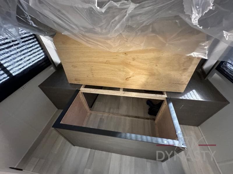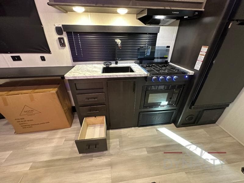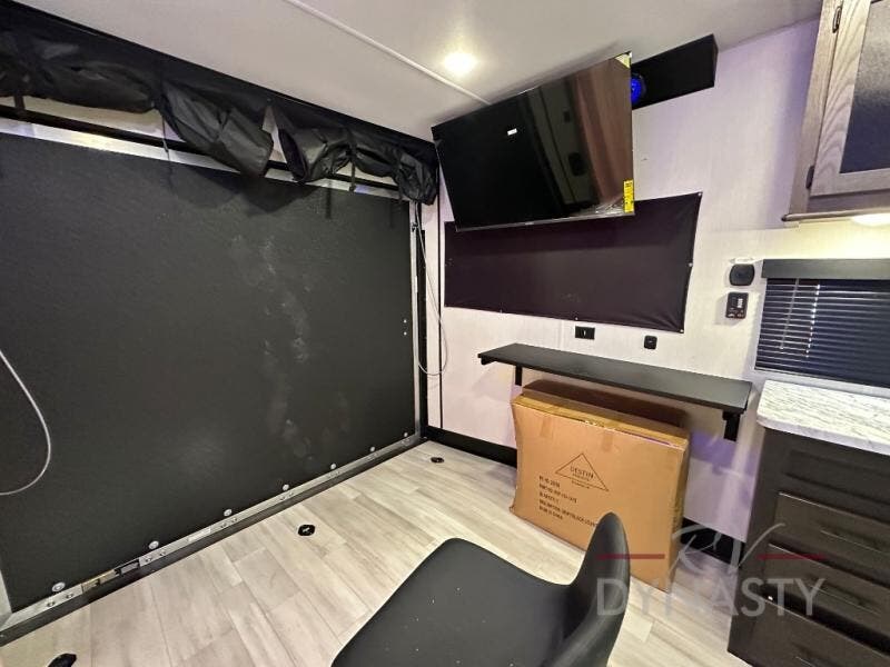 You can't go wrong when you have this toy hauler in tow! There is 14' 6" of cargo space for your toys plus a ramp door and patio deck so you can entertain guests. The two burner cooktop will allow you to make meals each day, and the removable dinette table and flip-up table with two seats gives you a place to dine. A full bath will eliminate the need to use the camp's facilities, and the front private bedroom is sure to make you feel right at home. Here, you'll enjoy a Wolf Pack king bed, dual wardrobes, and an overhead cabinet for more storage. And your guest can sleep on the manual bunk bed above the dinette in the garage!
