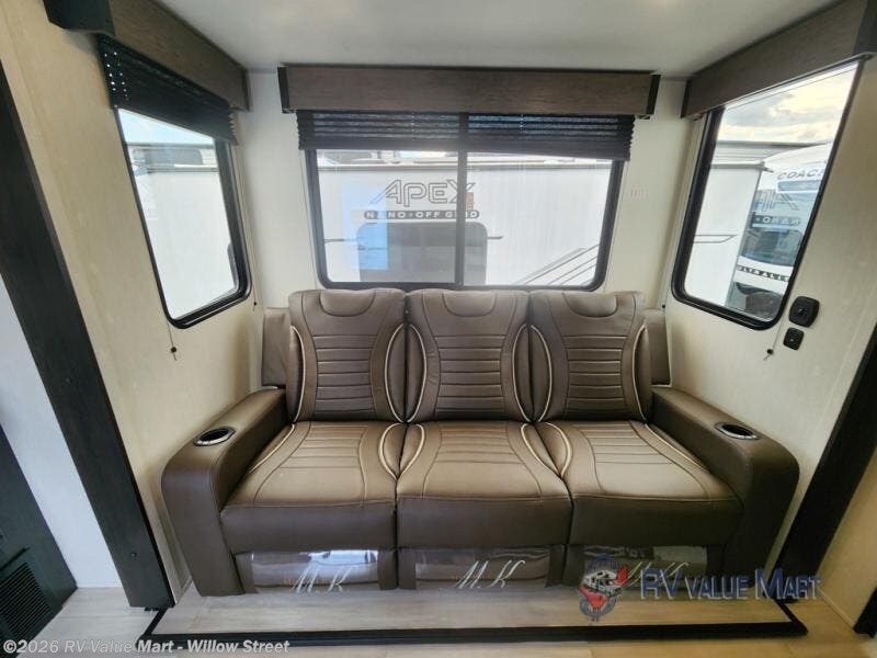 You can't go wrong in this spacious toy hauler with a 12' 6" garage! There is a flip-up counter with stools where you can eat each day, or you can take your plate outdoors to eat under the 21' power awning. A quick set bed system is also found in the garage to give guests a place to sleep! The combined kitchen and living area includes a sofa slide out, appliances to make meals each day, and an entertainment center with a fireplace. There is also an XL pantry and drawers hidden behind the TV for smart storage spaces. The RV king bed is sure to provide a great night's rest, and there are dual nightstands and dual wardrobes to keep your things tidy.