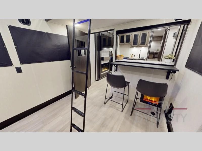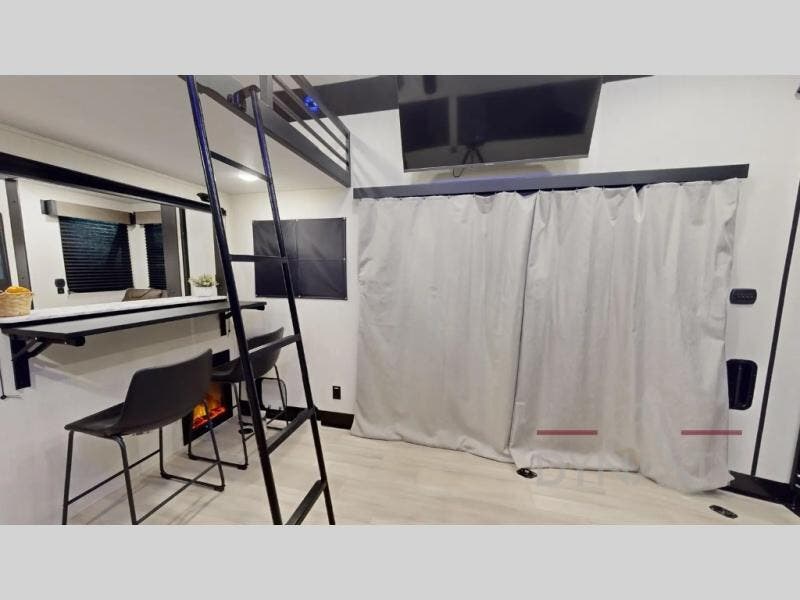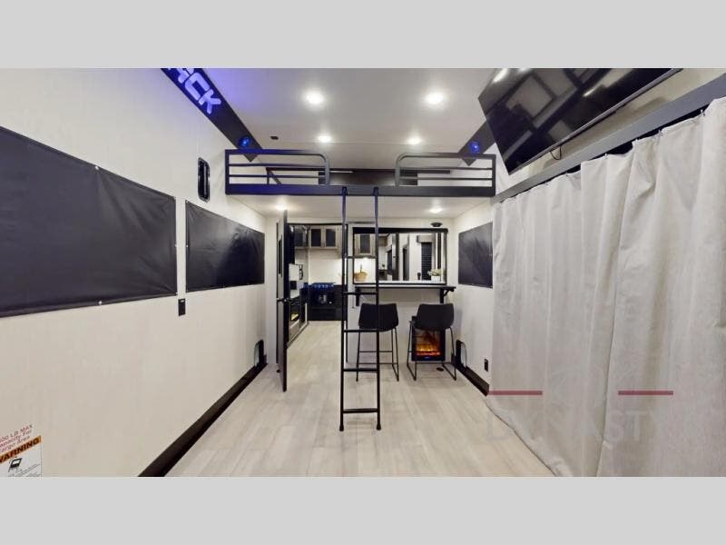 Fun at the campground begins with this toy hauler in tow! There is a 13' separate garage with a loft above for guests plus a patio deck to entertain guests. Your crew can get comfy on the theater seating across from the fireplace, and there is a hidden pantry behind here to keep food stocked. The two flip-up countertops with stools provides a fun place to dine since there is a window between, or you can head outdoors to enjoy some fresh air under the two power awnings. A full bath lets you freshen up after a trail ride, and the front private bedroom gives you your own space at night. This unit also features washer and dryer prep in the bedroom so you can add those appliances if you wish!