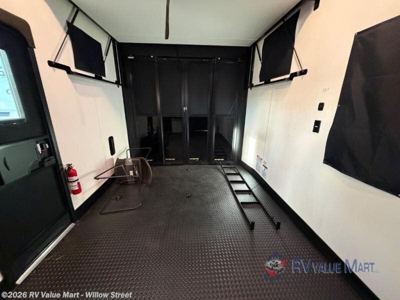 Fun at the campground begins with this toy hauler in tow! There is a 13' separate garage with a loft above for guests plus a patio deck to entertain guests. You'll also find a quick set bed system for additional sleeping space. Your crew can get comfy on the theater seating across from the fireplace, and there is an XL hidden pantry behind to keep food stocked. The two flip-up countertops with stools provides a fun place to dine since there is a window between, or you can head outdoors to enjoy some fresh air under the two power awnings. A full bath lets you freshen up after a trail ride, and the front private bedroom gives you your own space at night. This unit also features washer and dryer prep in the bedroom so you can add those appliances if you wish!