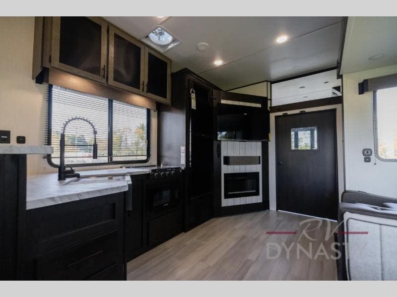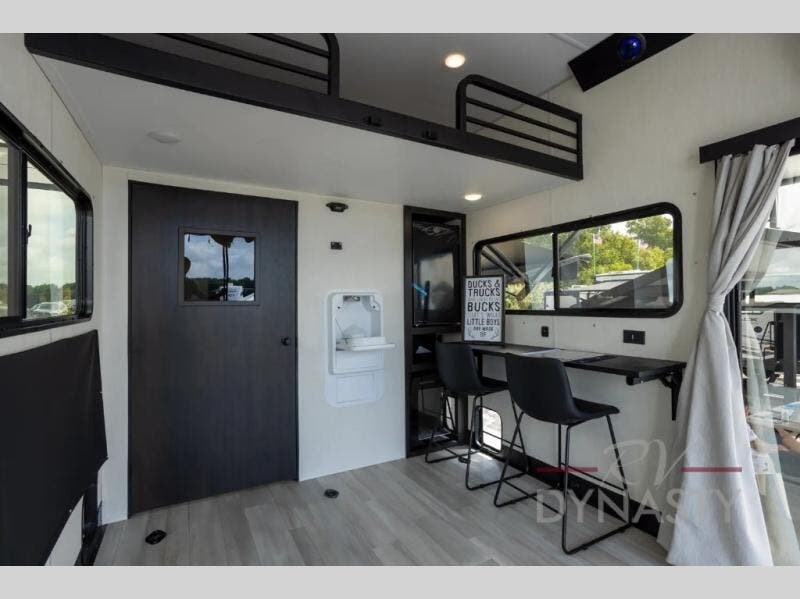 Fun at the campground begins with this dual entry toy hauler in tow! There is a 15' separate garage with glass patio doors, a loft above for guests, plus a patio deck to entertain guests. Your crew can get comfy on the theater seating or booth dinette, and there is an entertainment center with a fireplace and a hidden pantry for snacks. The chef of your group will love the full interior kitchen, along with an outdoor kitchen when the weather is nice. A full bath lets you freshen up after a trail ride, and the front private bedroom gives you your own space at night. This unit also features washer and dryer prep in the bedroom so you can add those appliances if you wish!