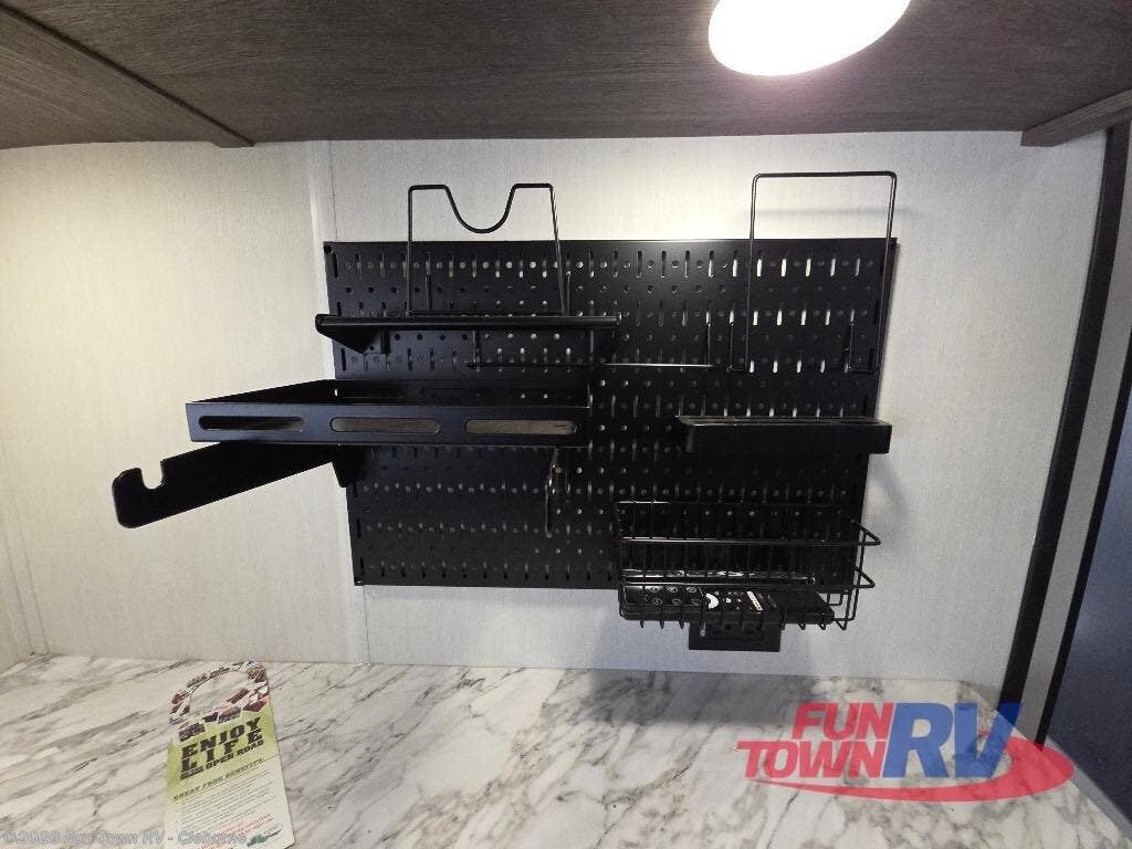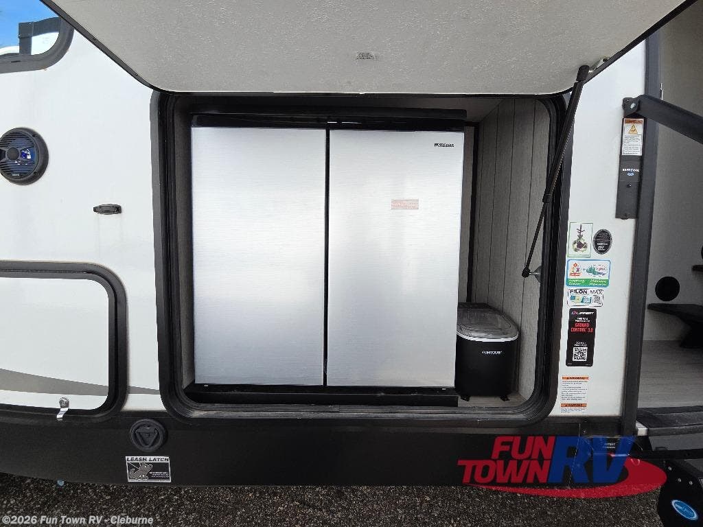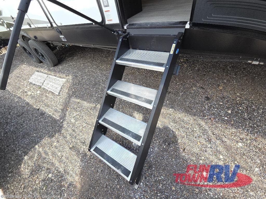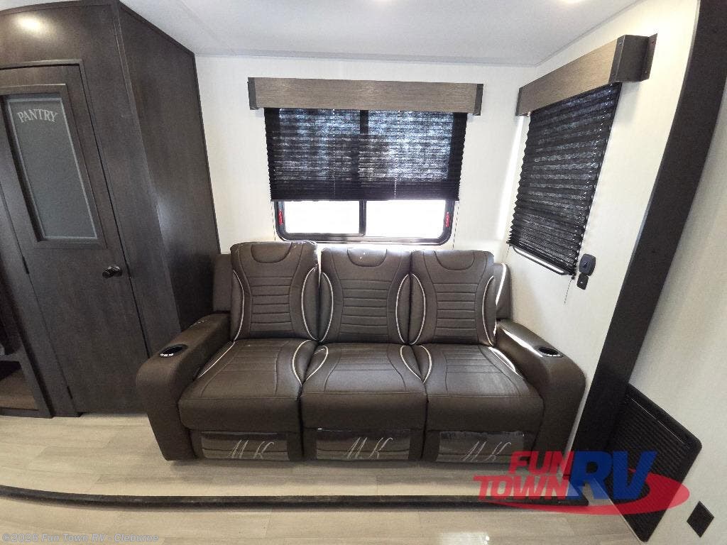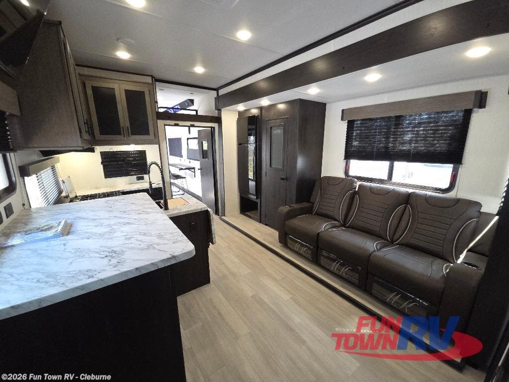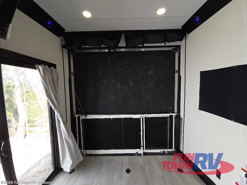 Fun at the campground begins with this dual entry toy hauler in tow! There is a 15' separate garage, a loft above for guests, plus a patio deck to entertain guests. There is also an optional Murphy bed system in the garage if you need additional sleeping space! Your crew can get comfy on the theater seating or booth dinette, and there is an entertainment center with a fireplace and a hidden XL pantry for snacks. The chef of your group will love the full interior kitchen, along with an outdoor mini kitchen when the weather is nice. A full bath lets you freshen up after a trail ride, and the front private bedroom gives you your own space at night. This unit also features washer and dryer prep in the bedroom so you can add those appliances if you wish!