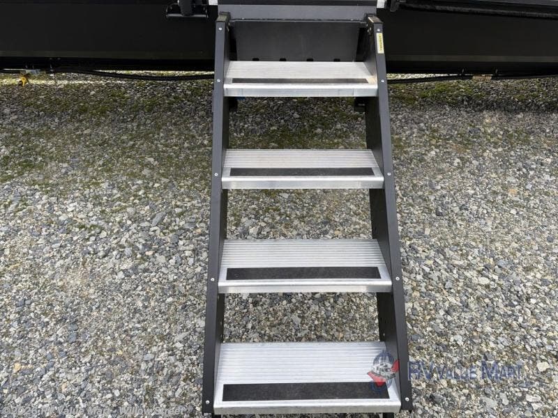 This toy hauler has everything you and your partner need to have a fantastic experience on the road! Unwind in the front bedroom, fitted with a large RV king bed, overhead cabinets, and nightstands on each side of the bed, perfect for keeping all your clothes organized. In the kitchen area, you will find a 12V refrigerator, overhead cabinets, an XL pantry, a microwave, and a TV with a fireplace. Your guests can turn the garage into their bedroom at night since there is a quick set bed system above, a loft/storage, a flip-up top with stools, plus a half bath with folding walls and a flip-down recessed sink!