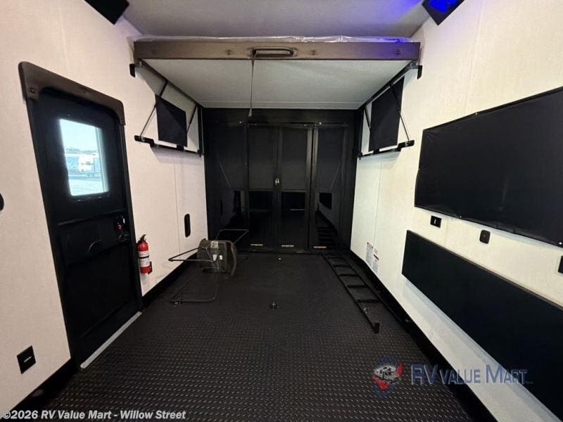 This toy hauler has everything you and your partner need to have a fantastic experience on the road! Unwind in the front bedroom, fitted with a large RV king bed, overhead cabinets, and nightstands on each side of the bed, perfect for keeping all your clothes organized. In the kitchen area, you will find a 12V refrigerator, overhead cabinets, an XL pantry, a microwave, and a TV with a fireplace. Your guests can turn the garage into their bedroom at night since there is a quick set bed system above, a loft/storage, a flip-up top with stools, plus a half bath with folding walls and a flip-down recessed sink!