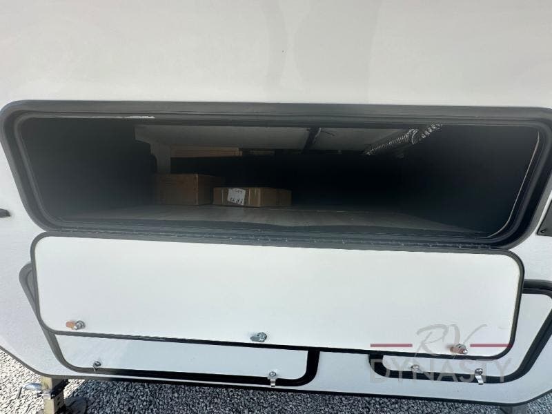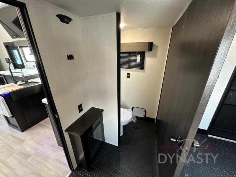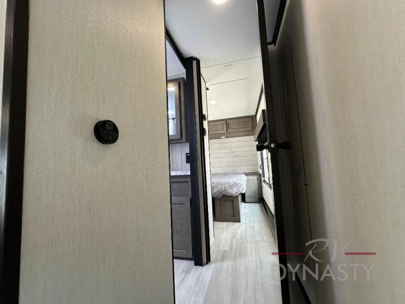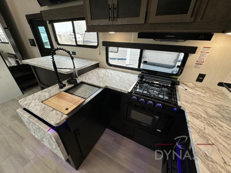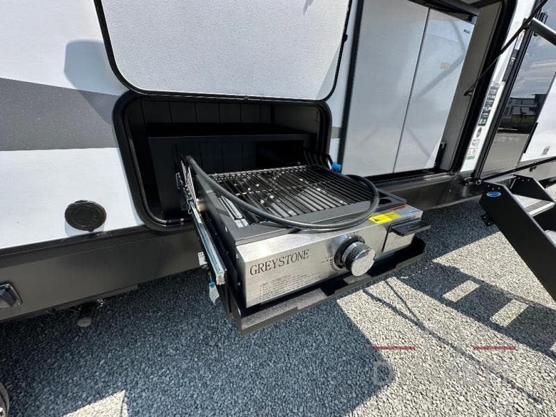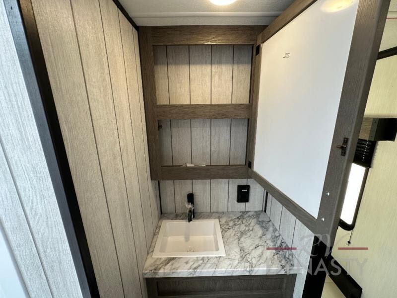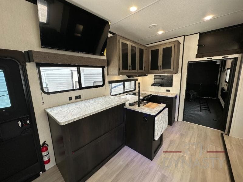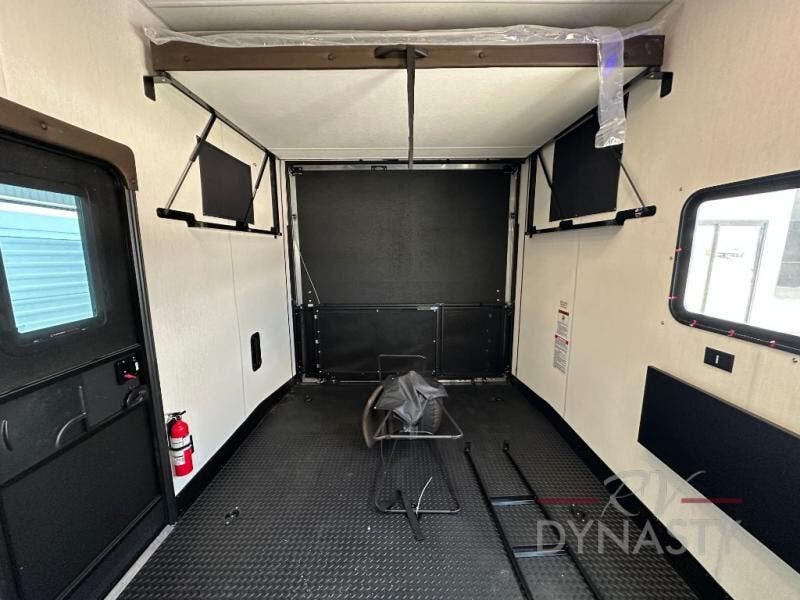 Fun at the campground begins with this dual entry toy hauler in tow! There is a 15' 6" separate garage with glass patio doors, a loft above for guests, a half bath with folding walls and a flip-down recessed bath sink. The combined kitchen and living room features a U-shaped kitchen with a flip-up countertop, a sofa slide out, and a bartop with two stools. There is even an outdoor kitchen on the other side of this counter so you can make breakfast as the sun comes up. A full bath lets you freshen up after a trail ride, and the front private bedroom gives you your own space at night. This unit also features washer and dryer prep in the bedroom so you can add those appliances if you wish!