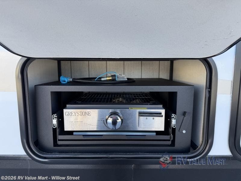 Fun at the campground begins with this dual entry toy hauler in tow! There is a 15' 6" separate garage with glass patio doors, a loft above for guests, a half bath with folding walls and a flip-down recessed bath sink. The combined kitchen and living room features a U-shaped kitchen with a flip-up countertop, a sofa slide out, and a bartop. There is even an outdoor kitchen on the other side of this counter so you can make breakfast as the sun comes up. A full bath lets you freshen up after a trail ride, and the front private bedroom gives you your own space at night. This unit also features washer and dryer prep in the bedroom so you can add those appliances if you wish. Your guests can sleep on the quick set bed system in the garage or in the loft if it's not being used for storage!