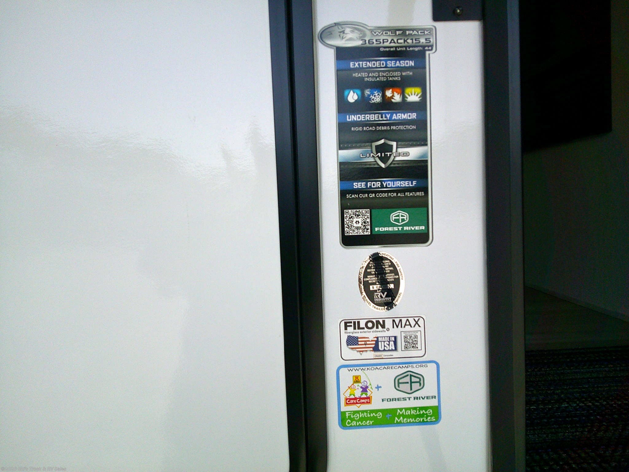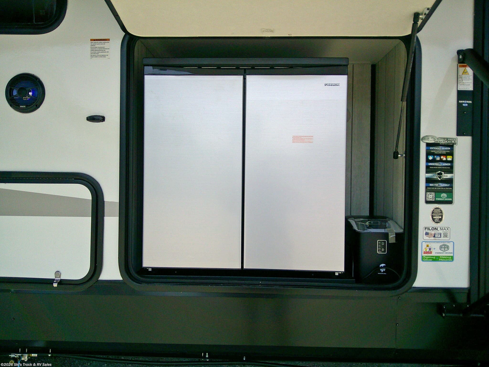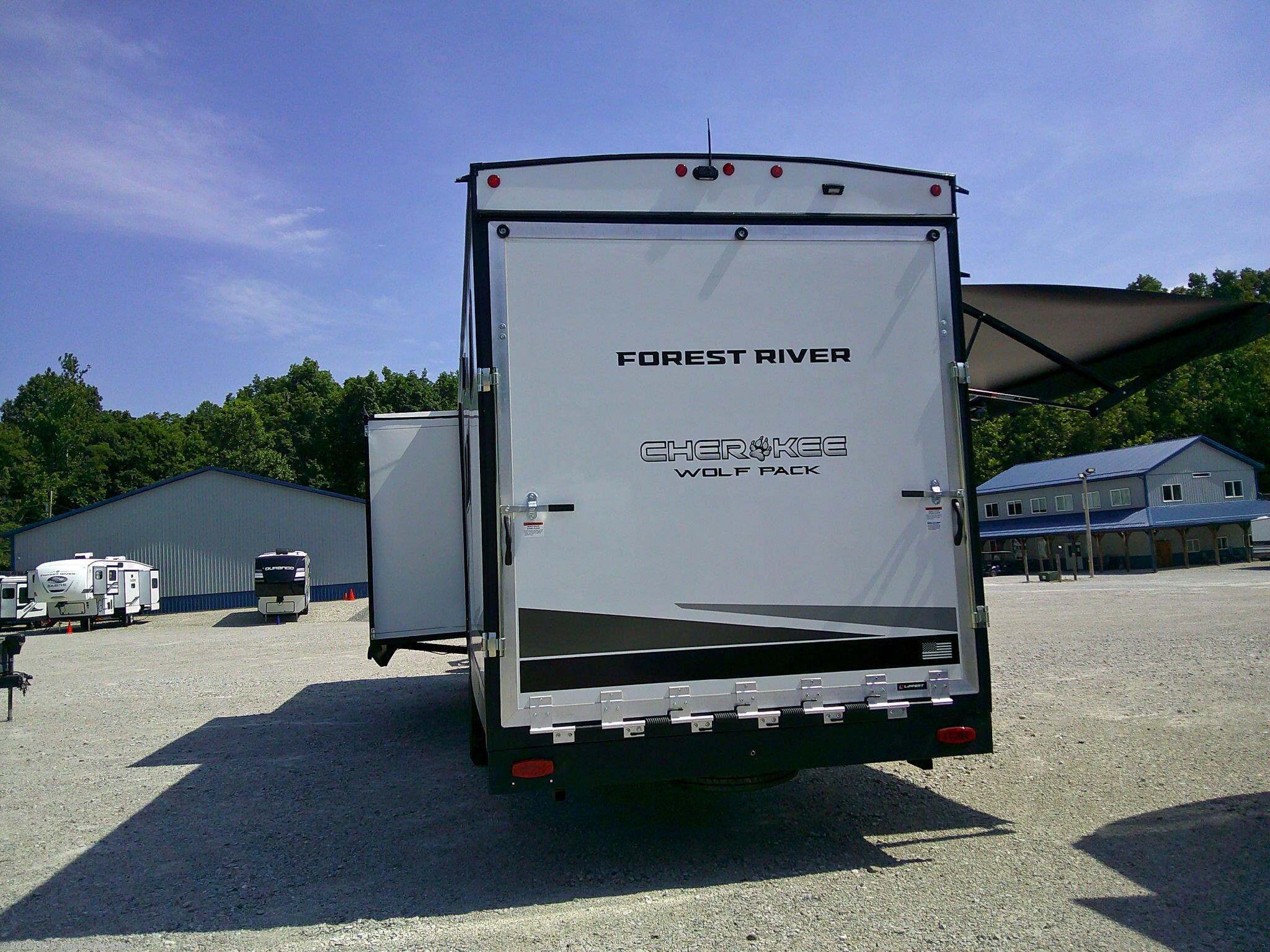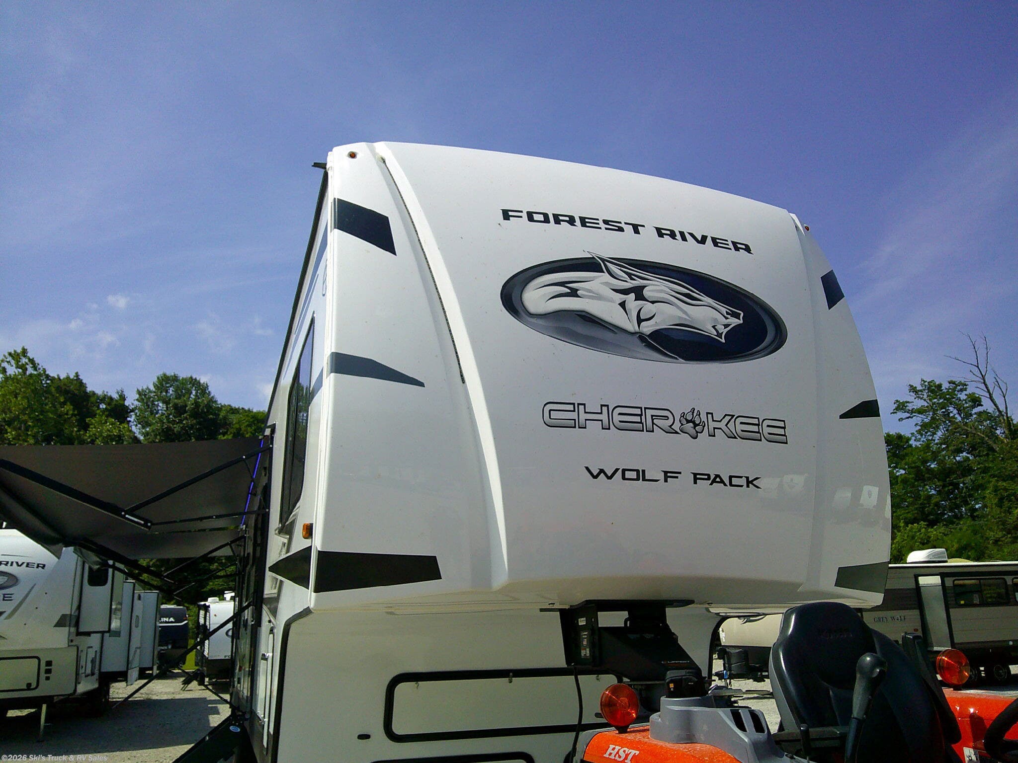 2026 Forest River Cherokee Wolf Pack 365PACK15.5 Fifth Wheel Toy Hauler; 44 Foot; 1 Slide; Sleeps 5-6; Hitch Weight: 2910 Lbs.; Dry Weight: 12,807 Lbs.; 50 Amp; Power Front, Middle and Rear Stabilizer Jacks; 96 Gal. Fresh Water Cap.; 88 Gal. Black Water Cap.; 88 Gal. Gray Water Cap.; Two 20 Lbs. Propane Tanks; Two ACs: 15,000 / 13,500 BTUs; 35,000 BTU Furnace; 10 C.F. (12V) Refrigerator; On Demand Water Heater; Convection Microwave; 3-Burner Stove; Three TV Jacks; 50 In. TV; 32 In. TV; Speakers; One Fireplace; Barstools; Pantry; Stainless Steel Farm Sink; Theater Seats; Two Euro Recliner Chairs; RV King Bed; Single Loft Bunk; Pull-Down Garage Bed; 1.5 Bath: One Bathroom with Shower; Porcelain Toilet; Half Bath; Washer/Dryer Prep.; Garage: 15.5 Ft. x 8.125 Ft. ; Party Deck with Railing; Two Power Awnings with LED Lights: 12 Ft. / 18 Ft.; Backup Camera; Solar Package; Outside Kitchen with Grill; Outside Shower; Exterior Storage; Foldup Steps; Grab Handle; Battery Disconnect; Black Tank Flush; Tank Heaters; Fiberglass Sidewalls; Tinted Windows; Aluminum Wheels; Spare Tire; One Year Limited Warranty; Financing Available; Super Nice Fifth Wheel Toy Hauler for the Price: $56,995. Call Skis Truck & RV Sales at 765-344-1111 or visit us at for more information.