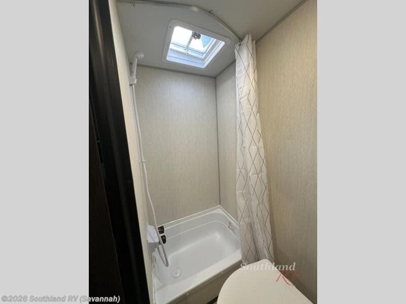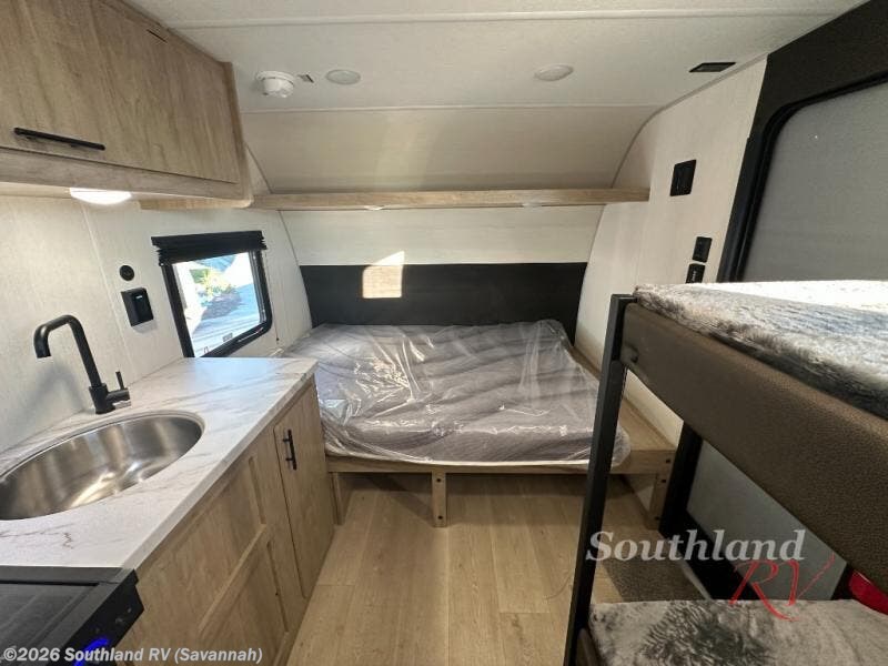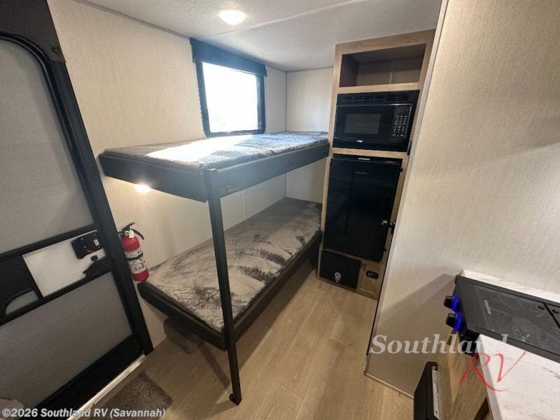This travel trailer is perfect for epic road trips, memorable camping excursions, or rejuvenating getaways. The private bathroom is equipped with everything you need for a comfortable stay, providing a convenient spot to freshen up after a long day of exploring. The kitchen is equipped with a refrigerator for keeping drinks and ingredients fresh, and a microwave for quick reheating. The bunk beds are a great spot to take a nap or a kid's sleeping space. Overhead cabinets provide additional storage for cookware, dishes, and other essentials. In addition, the queen-sized bed provides a comfortable sleeping space, perfect for relaxing after a long day.