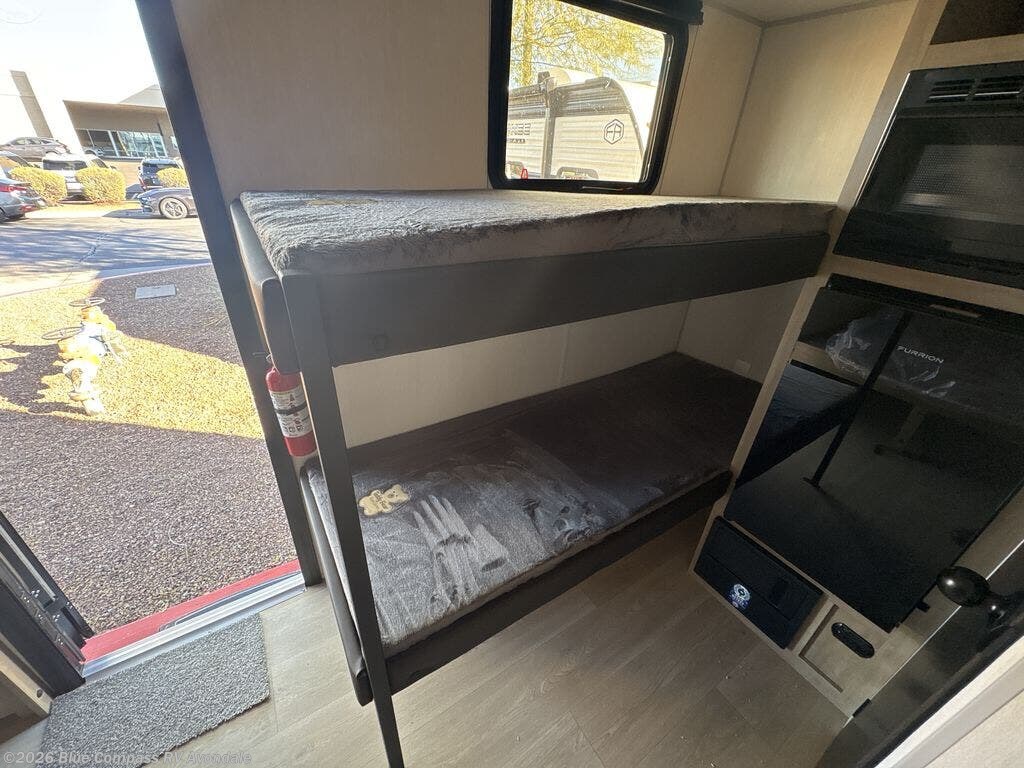 This travel trailer is perfect for epic road trips, memorable camping excursions, or rejuvenating getaways. The private bathroom is equipped with everything you need for a comfortable stay, providing a convenient spot to freshen up after a long day of exploring. The kitchen is equipped with a refrigerator for keeping drinks and ingredients fresh, and a microwave for quick reheating. The bunk beds are a great spot to take a nap or a kid's sleeping space. Overhead cabinets provide additional storage for cookware, dishes, and other essentials. In addition, the queen-sized bed provides a comfortable sleeping space, perfect for relaxing after a long day.