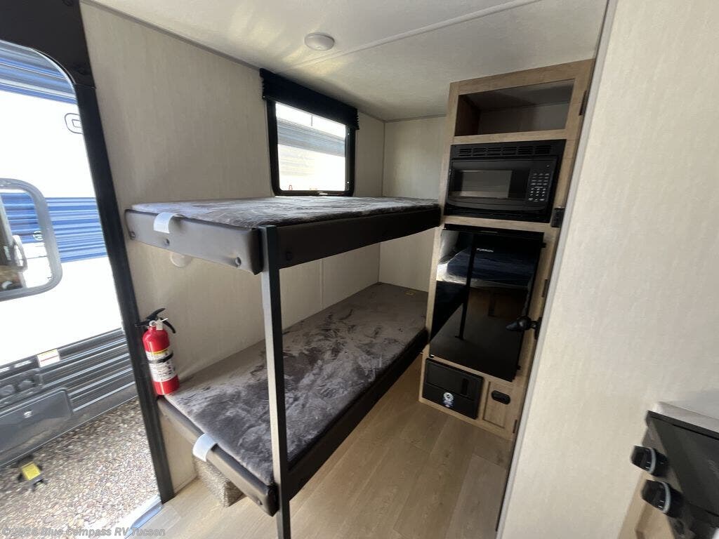 This travel trailer is perfect for epic road trips, memorable camping excursions, or rejuvenating getaways. The private bathroom is equipped with everything you need for a comfortable stay, providing a convenient spot to freshen up after a long day of exploring. The kitchen is equipped with a refrigerator for keeping drinks and ingredients fresh, and a microwave for quick reheating. The bunk beds are a great spot to take a nap or a kid's sleeping space. Overhead cabinets provide additional storage for cookware, dishes, and other essentials. In addition, the queen-sized bed provides a comfortable sleeping space, perfect for relaxing after a long day.