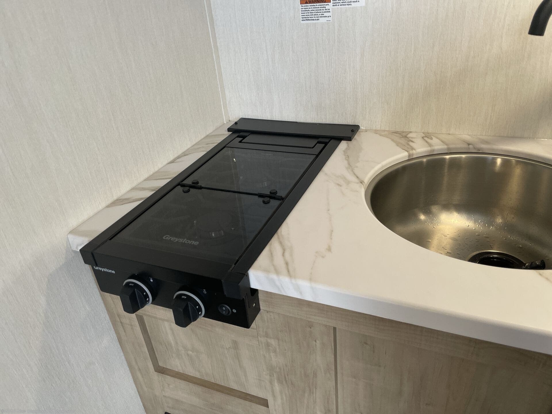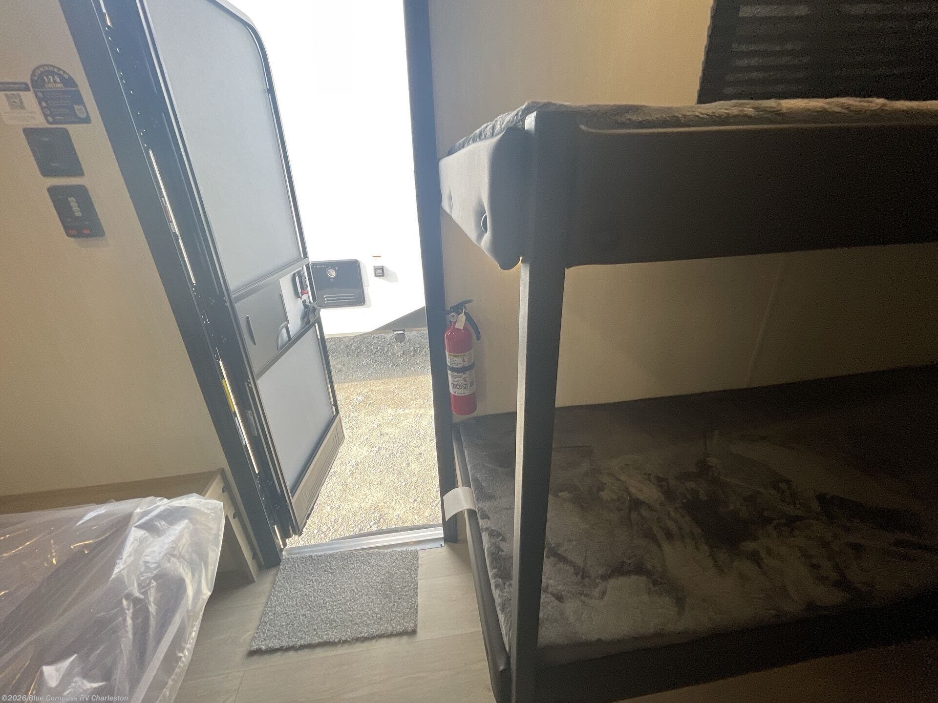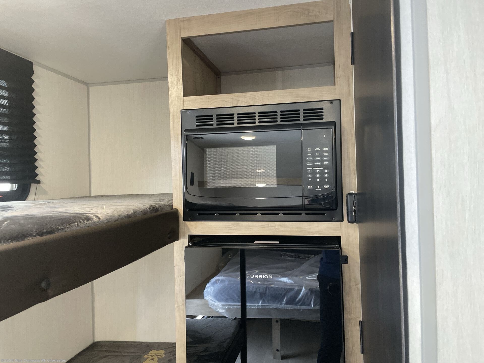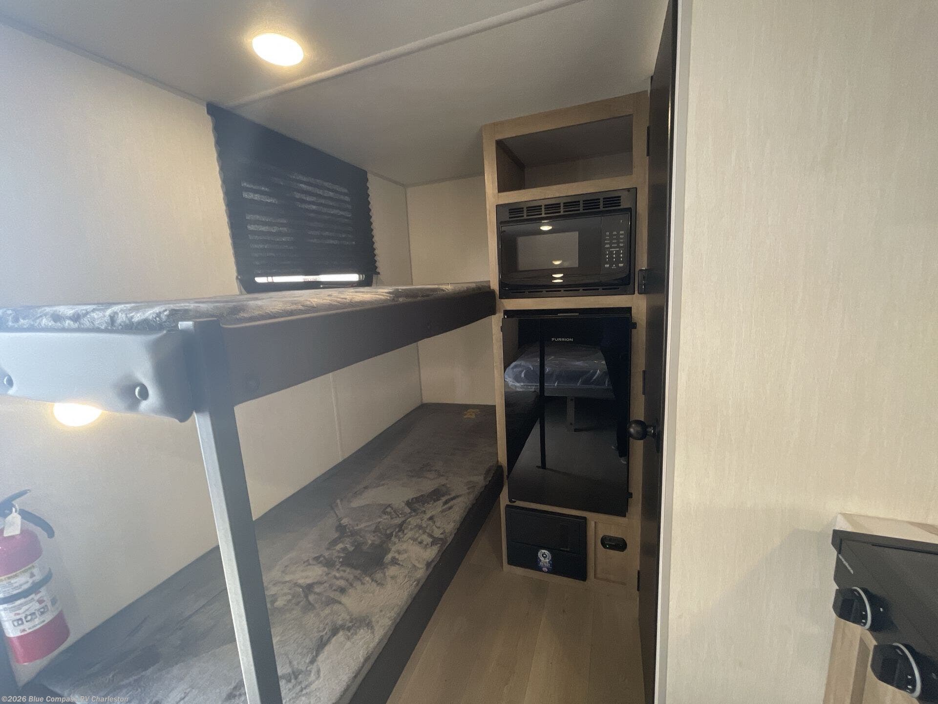This travel trailer is perfect for epic road trips, memorable camping excursions, or rejuvenating getaways. The private bathroom is equipped with everything you need for a comfortable stay, providing a convenient spot to freshen up after a long day of exploring. The kitchen is equipped with a refrigerator for keeping drinks and ingredients fresh, and a microwave for quick reheating. The bunk beds are a great spot to take a nap or a kid's sleeping space. Overhead cabinets provide additional storage for cookware, dishes, and other essentials. In addition, the queen-sized bed provides a comfortable sleeping space, perfect for relaxing after a long day.