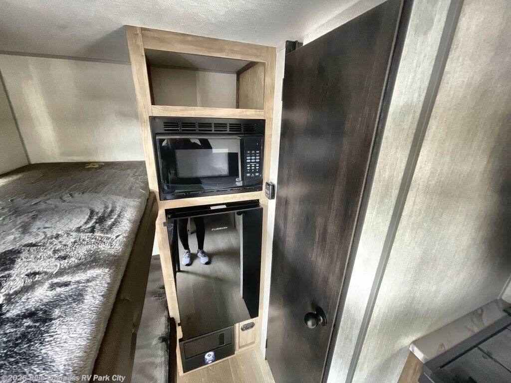 This travel trailer is perfect for epic road trips, memorable camping excursions, or rejuvenating getaways. The private bathroom is equipped with everything you need for a comfortable stay, providing a convenient spot to freshen up after a long day of exploring. The kitchen is equipped with a refrigerator for keeping drinks and ingredients fresh, and a microwave for quick reheating. The bunk beds are a great spot to take a nap or a kid's sleeping space. Overhead cabinets provide additional storage for cookware, dishes, and other essentials. In addition, the queen-sized bed provides a comfortable sleeping space, perfect for relaxing after a long day.