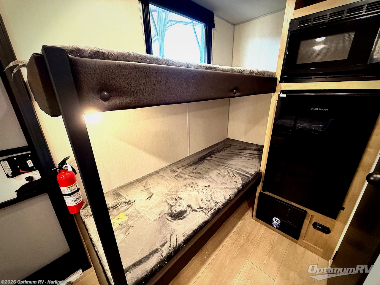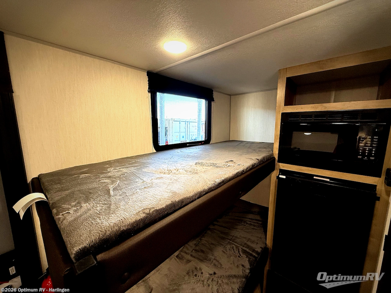 This travel trailer is perfect for epic road trips, memorable camping excursions, or rejuvenating getaways. The private bathroom is equipped with everything you need for a comfortable stay, providing a convenient spot to freshen up after a long day of exploring. The kitchen is equipped with a refrigerator for keeping drinks and ingredients fresh, and a microwave for quick reheating. The bunk beds are a great spot to take a nap or a kid's sleeping space. Overhead cabinets provide additional storage for cookware, dishes, and other essentials. In addition, the queen-sized bed provides a comfortable sleeping space, perfect for relaxing after a long day.
