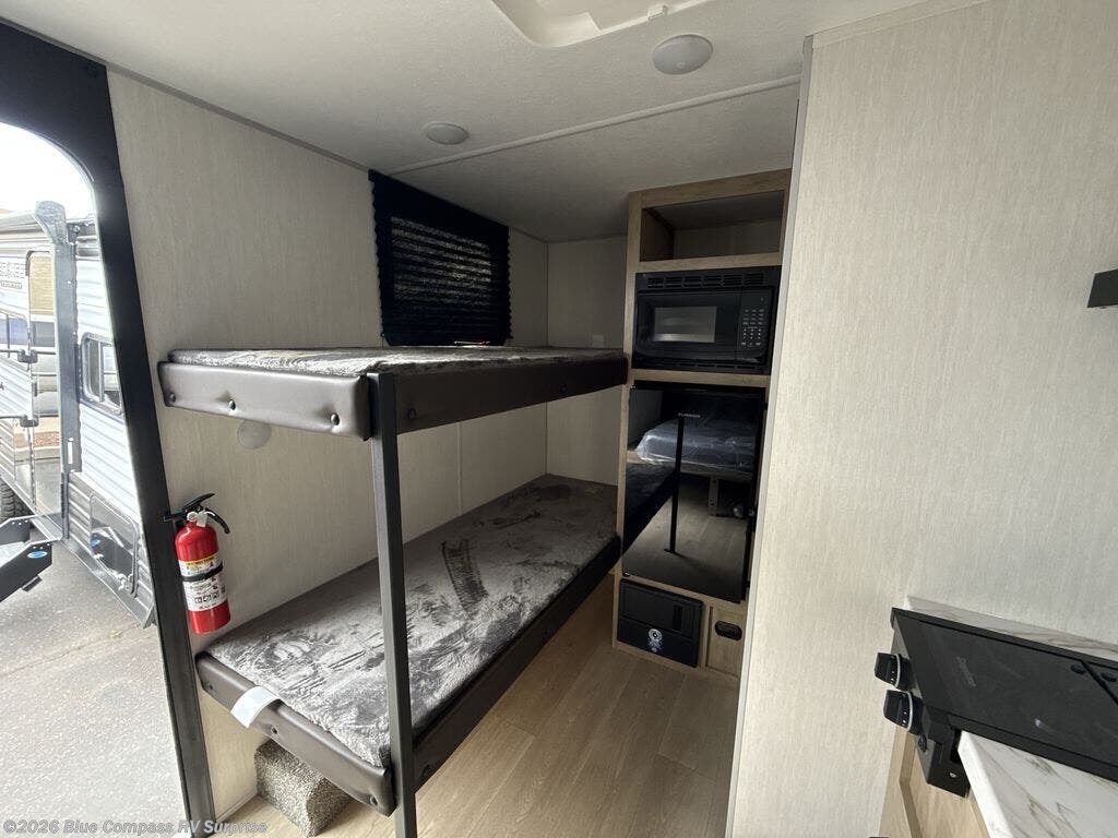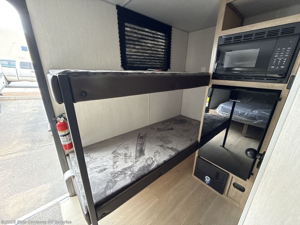This travel trailer is perfect for epic road trips, memorable camping excursions, or rejuvenating getaways. The private bathroom is equipped with everything you need for a comfortable stay, providing a convenient spot to freshen up after a long day of exploring. The kitchen is equipped with a refrigerator for keeping drinks and ingredients fresh, and a microwave for quick reheating. The bunk beds are a great spot to take a nap or a kid's sleeping space. Overhead cabinets provide additional storage for cookware, dishes, and other essentials. In addition, the queen-sized bed provides a comfortable sleeping space, perfect for relaxing after a long day.