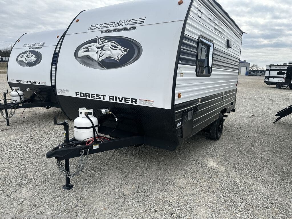Each one of these Forest River Cherokee Wolf Pup travel trailers and toy hauler are lightweight and easy to tow! They are fully self-contained with ample tank capacities, an abundance of storage space, and filled with at home amenities. The full bath and kitchen amenities will make life at the campground easier than ever, and the outdoor patio awning will provide an inviting outdoor space!