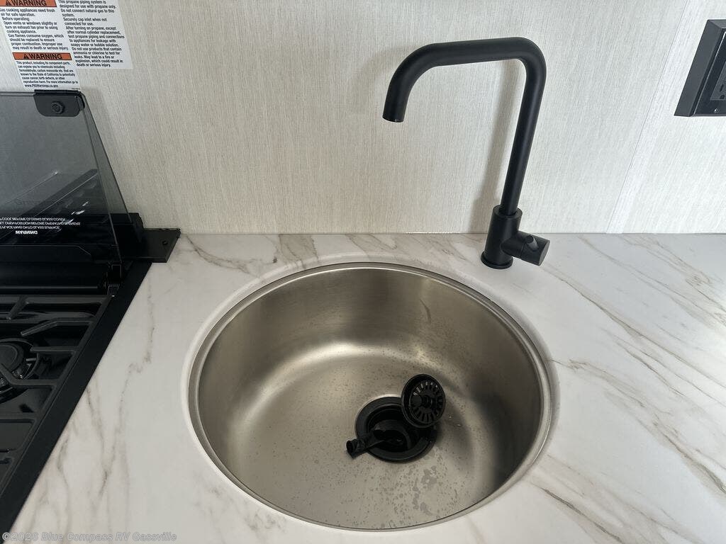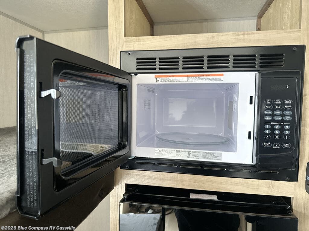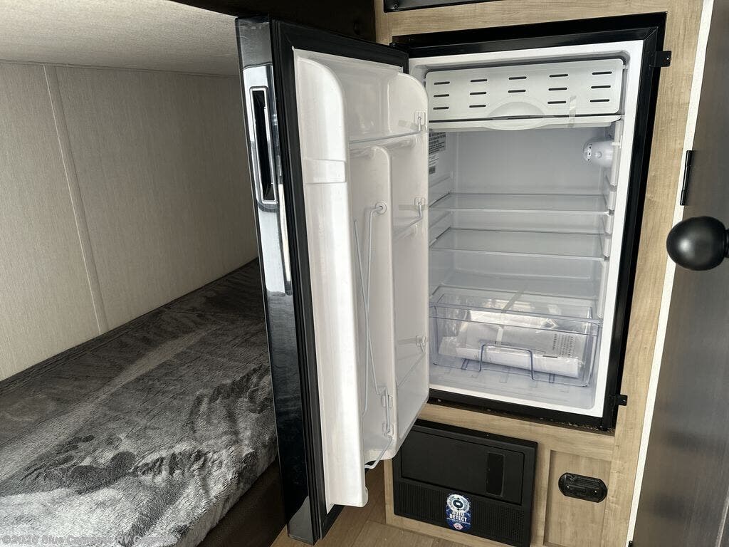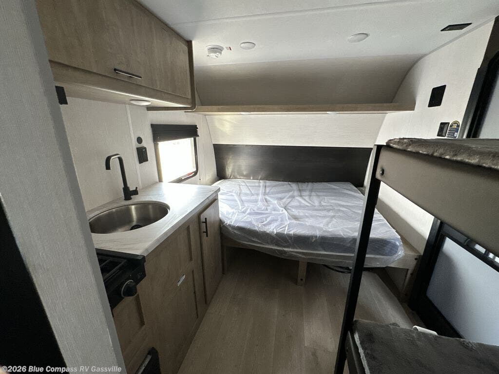 This travel trailer is perfect for epic road trips, memorable camping excursions, or rejuvenating getaways. The private bathroom is equipped with everything you need for a comfortable stay, providing a convenient spot to freshen up after a long day of exploring. The kitchen is equipped with a refrigerator for keeping drinks and ingredients fresh, and a microwave for quick reheating. The bunk beds are a great spot to take a nap or a kid's sleeping space. Overhead cabinets provide additional storage for cookware, dishes, and other essentials. In addition, the queen-sized bed provides a comfortable sleeping space, perfect for relaxing after a long day.