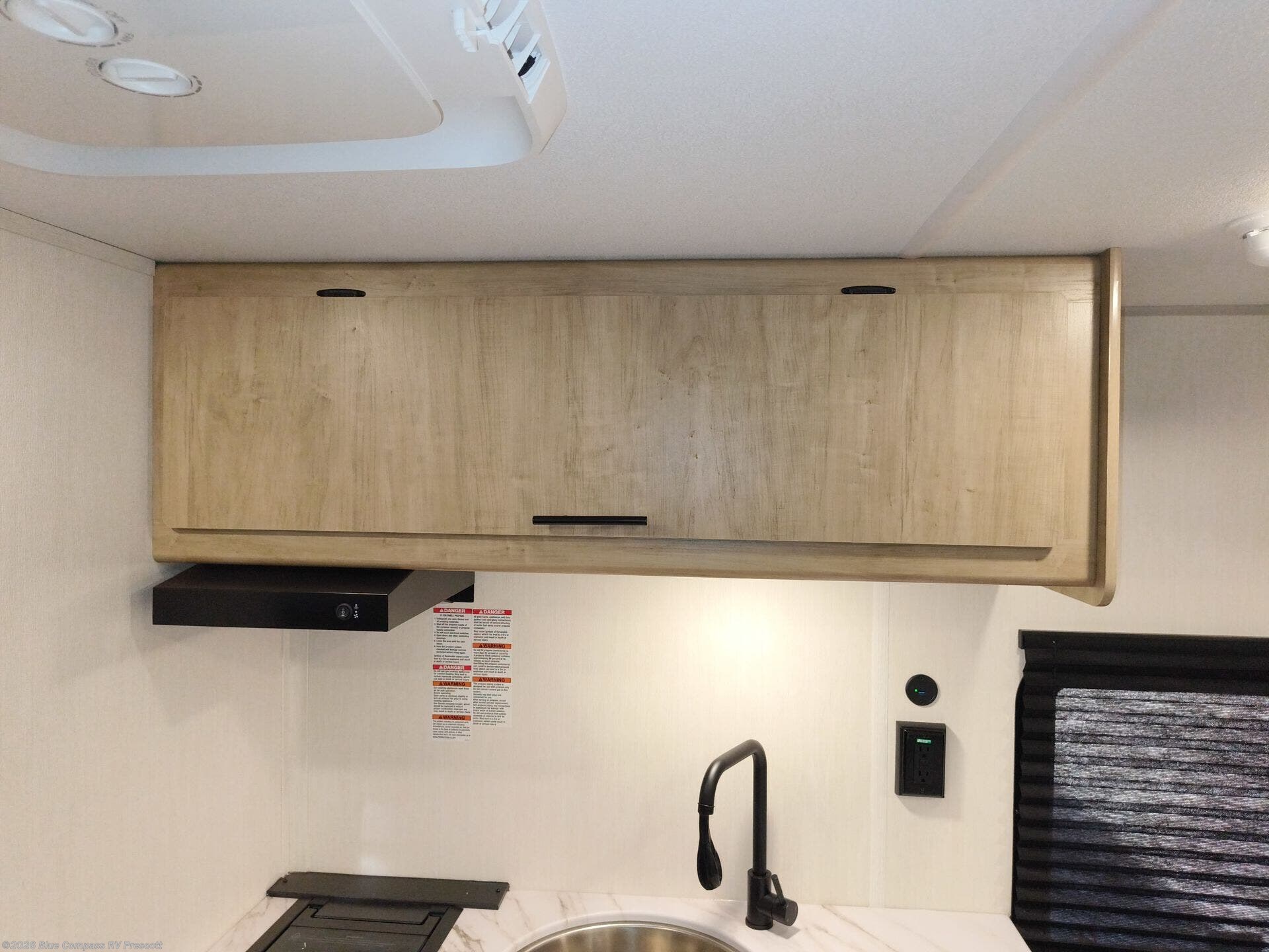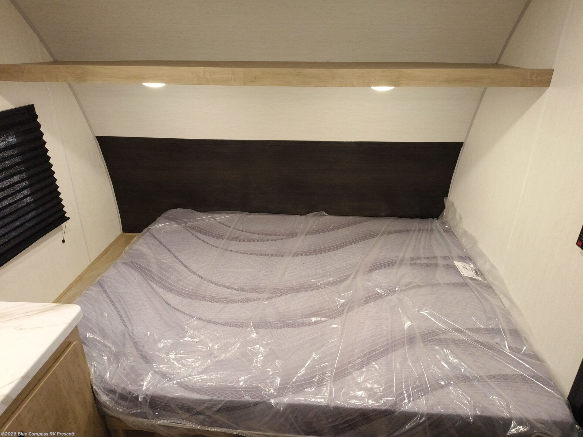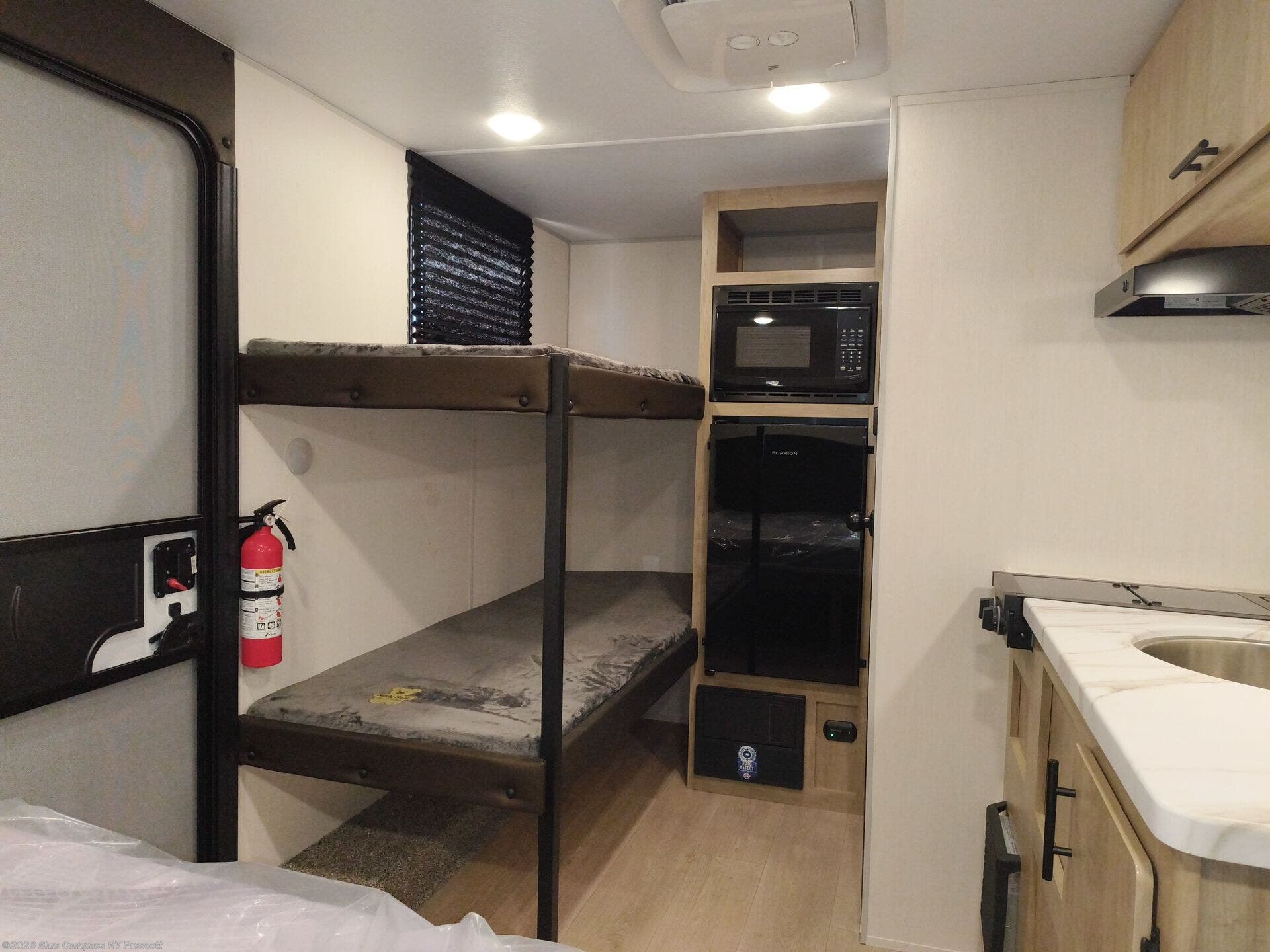 This travel trailer is perfect for epic road trips, memorable camping excursions, or rejuvenating getaways. The full bathroom is equipped with everything you need for a comfortable stay, providing a convenient spot to freshen up after a long day of exploring. The kitchen is equipped with a refrigerator for keeping drinks and ingredients fresh, and a microwave for quick reheating. The bunk beds are a great spot to take a nap or a kid's sleeping space. Overhead cabinets provide additional storage for cookware, dishes, and other essentials. In addition, the queen-sized bed provides a comfortable sleeping space, perfect for relaxing after a long day.