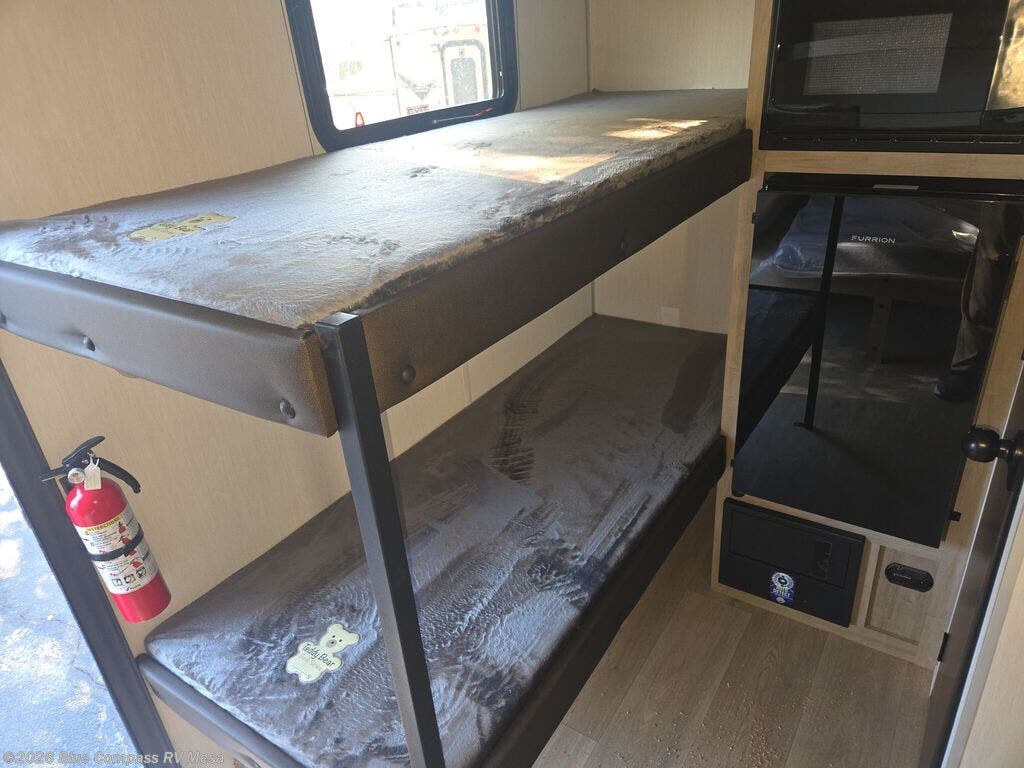 This travel trailer is perfect for epic road trips, memorable camping excursions, or rejuvenating getaways. The private bathroom is equipped with everything you need for a comfortable stay, providing a convenient spot to freshen up after a long day of exploring. The kitchen is equipped with a refrigerator for keeping drinks and ingredients fresh, and a microwave for quick reheating. The bunk beds are a great spot to take a nap or a kid's sleeping space. Overhead cabinets provide additional storage for cookware, dishes, and other essentials. In addition, the queen-sized bed provides a comfortable sleeping space, perfect for relaxing after a long day.