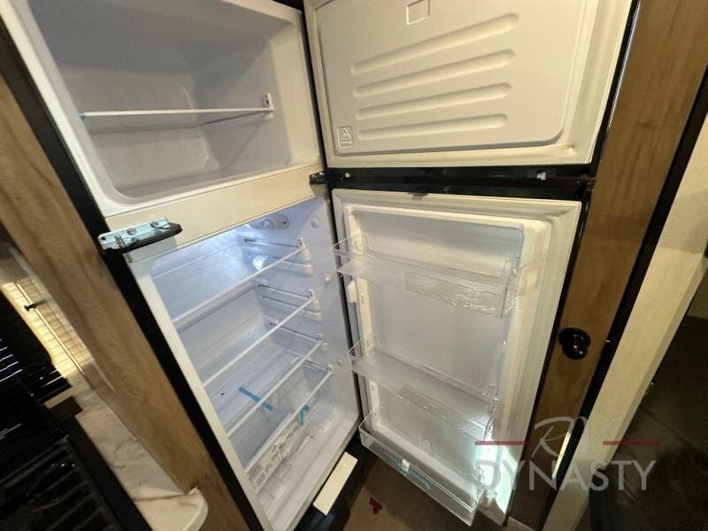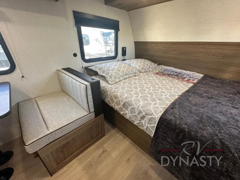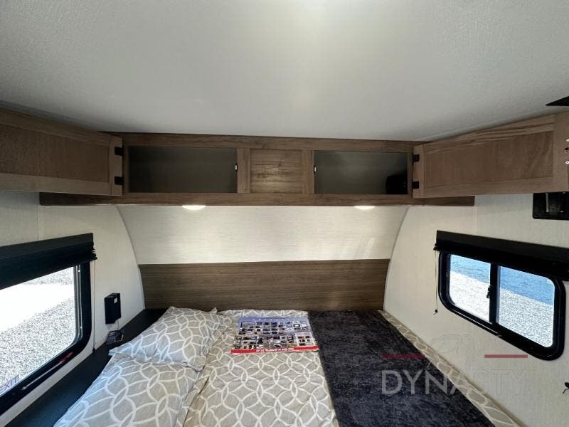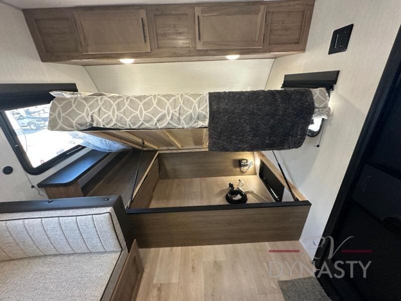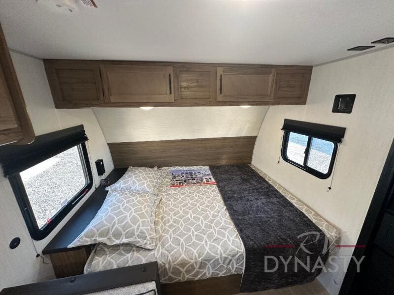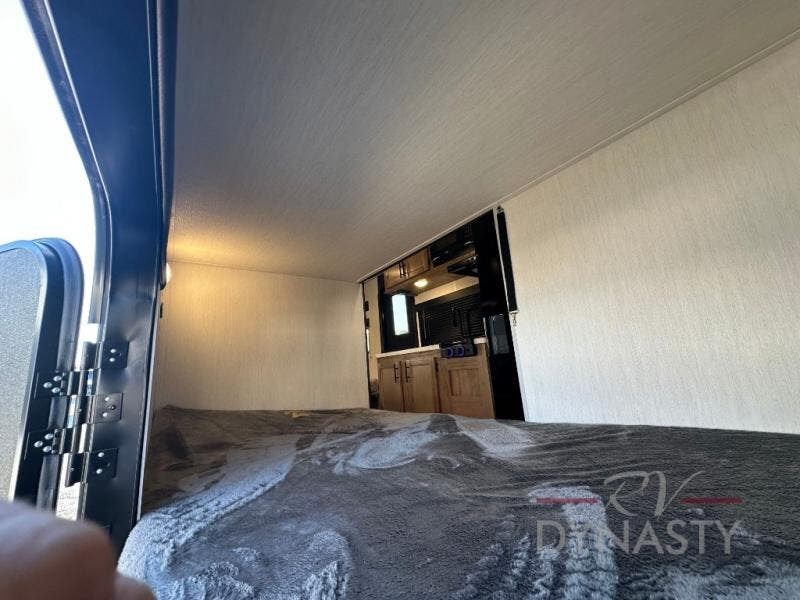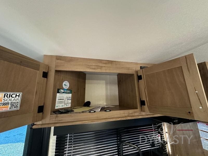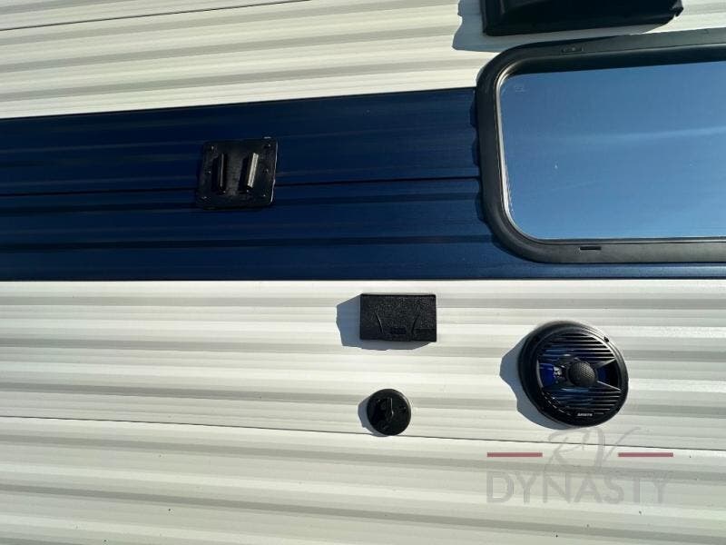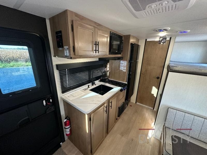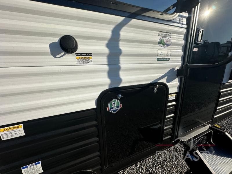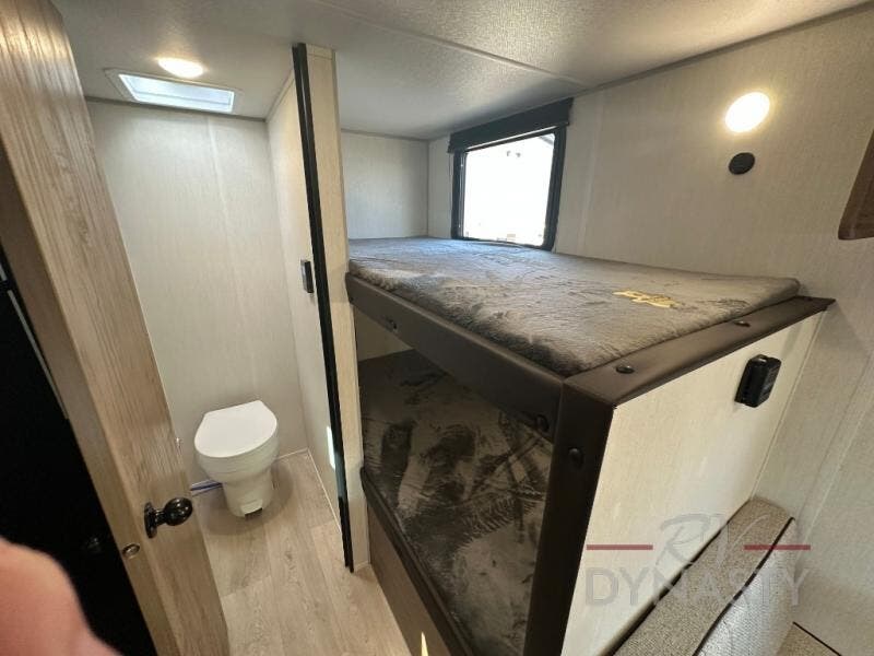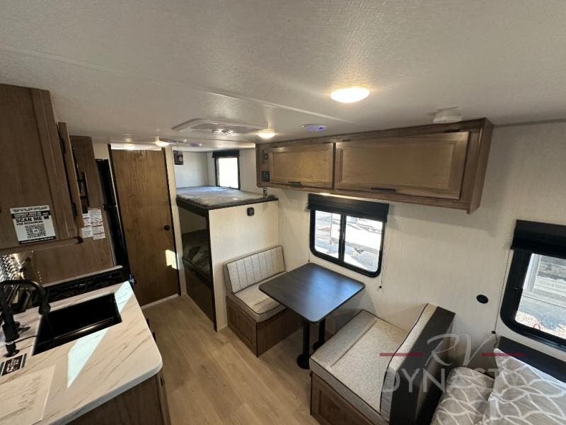 The whole family can sleep comfortably in this travel trailer! It has a set of bunk beds for the kids to sleep on, and you can sleep comfortably on the front queen bed with overhead cabinets and a shelf. There is even an exterior storage plus door that accesses the storage space under the bottom bunk. The chef will enjoy preparing their best home cooked meals either indoors with the high output cooktop or at the outside mini kitchen while staying protected by the 12' power awning!