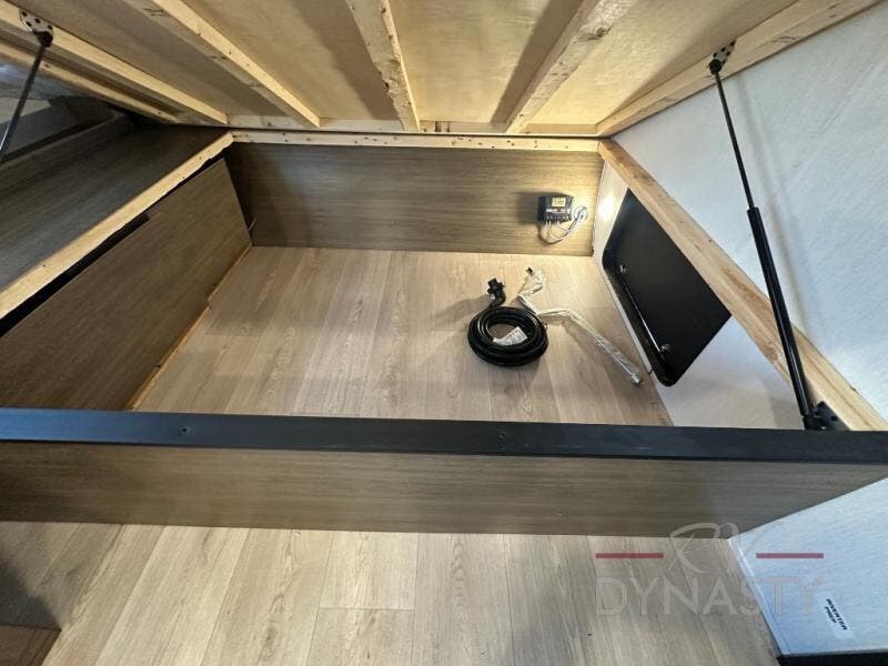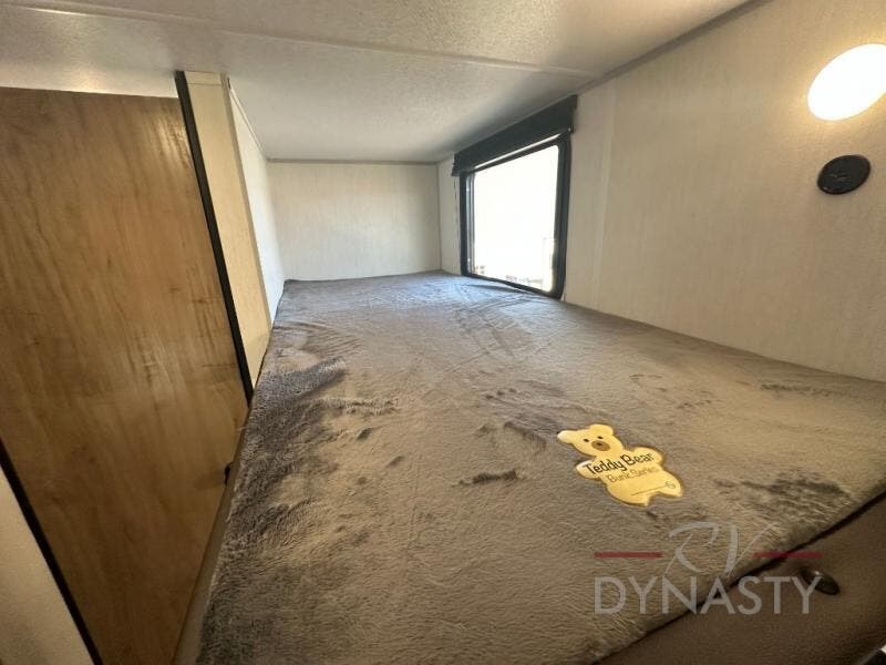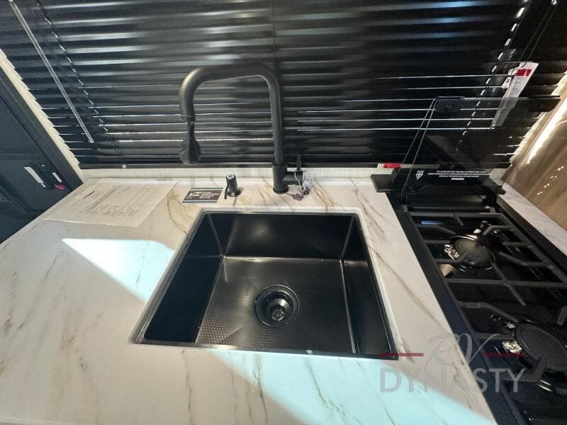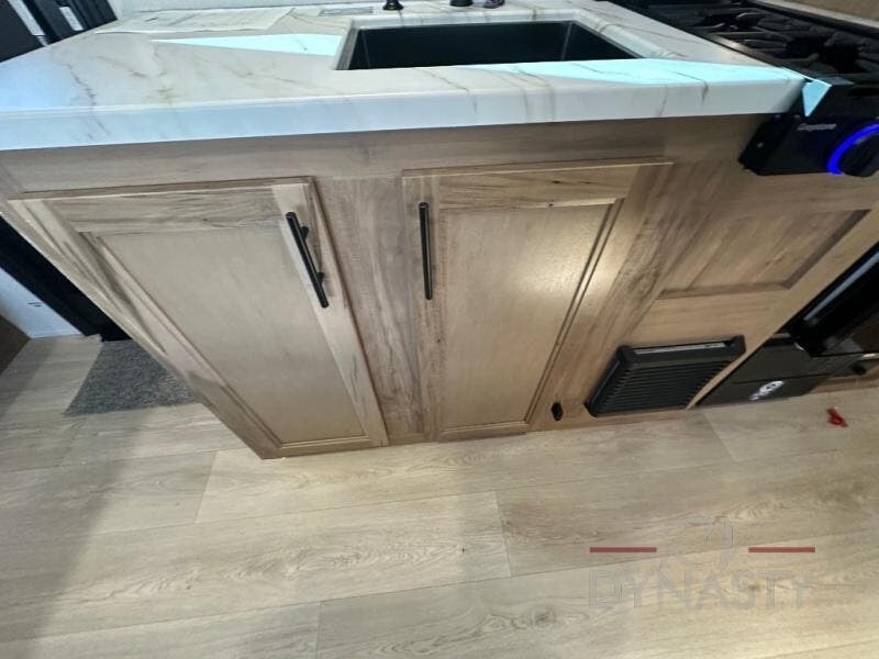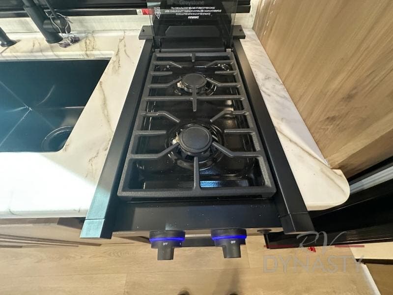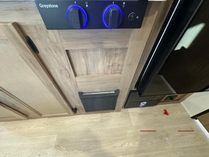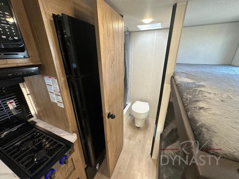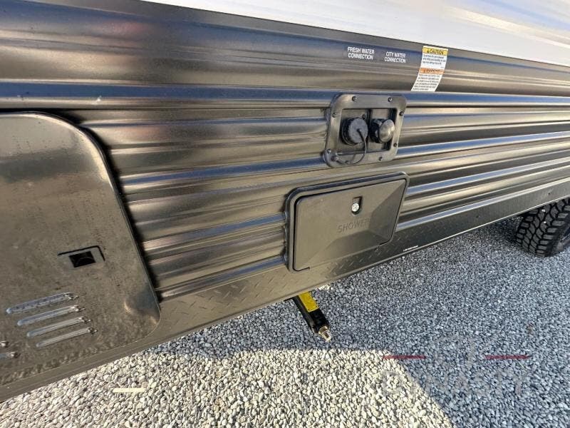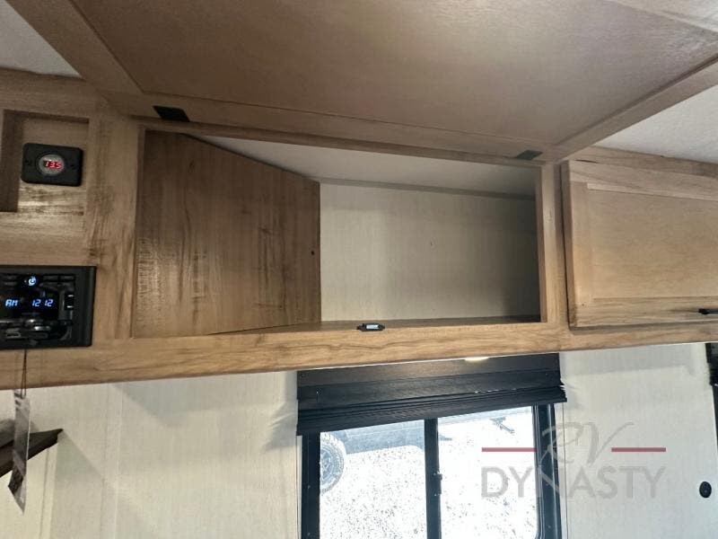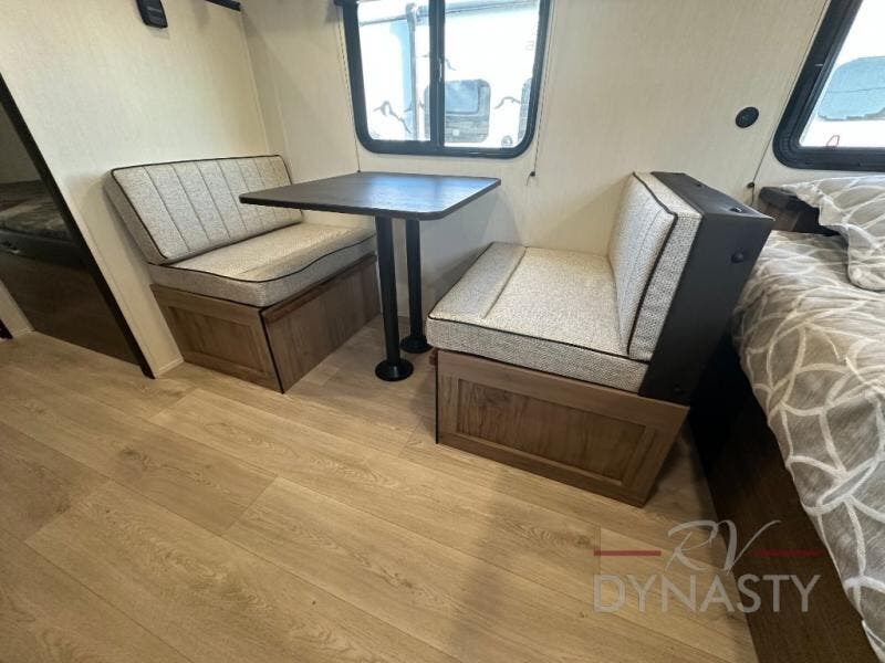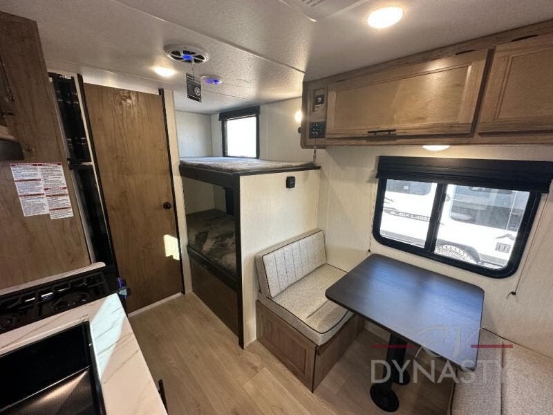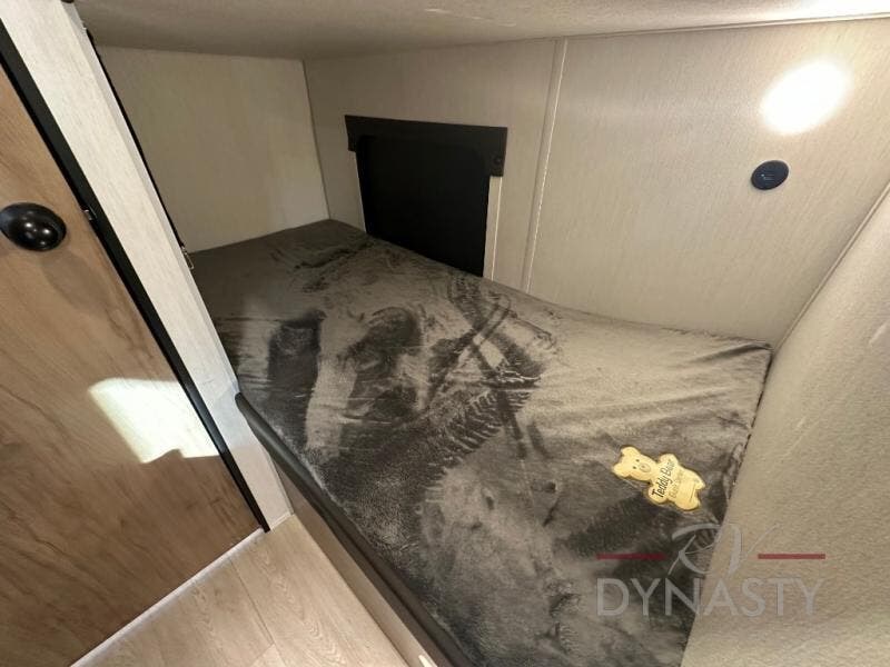 The whole family can sleep comfortably in this travel trailer! It has a set of bunk beds for the kids to sleep on, and you can sleep comfortably on the front queen bed with overhead cabinets and a shelf. There is even an exterior storage plus door that accesses the storage space under the bottom bunk. The chef will enjoy preparing their best home cooked meals either indoors with the high output cooktop or at the outside mini kitchen while staying protected by the 12' power awning!