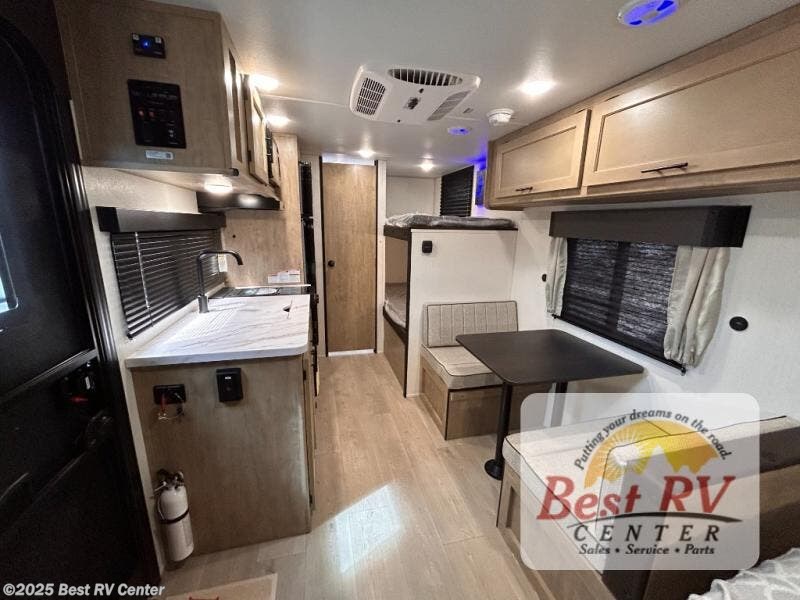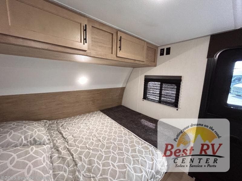 The whole family can sleep comfortably in this travel trailer! It has a set of bunk beds for the kids to sleep on, and you can sleep comfortably on the front queen bed with overhead cabinets and a shelf. There is even an exterior storage plus door that accesses the storage space under the bottom bunk. The chef will enjoy preparing their best home cooked meals either indoors with the high output cooktop or at the outside mini kitchen while staying protected by the 12' power awning!