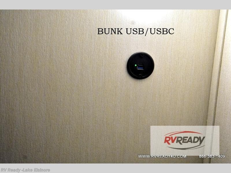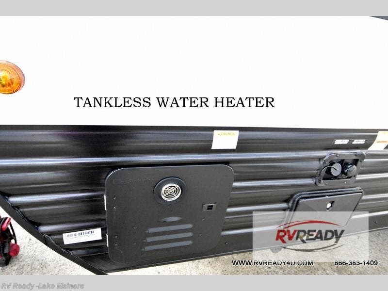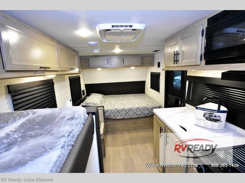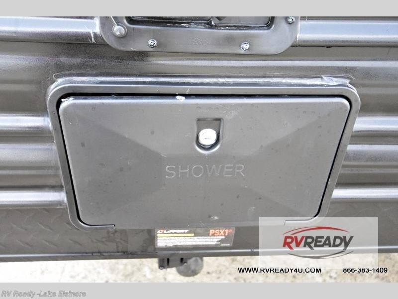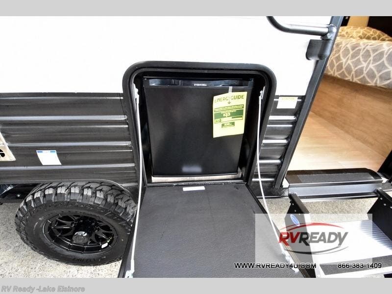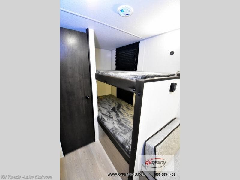 The whole family can sleep comfortably in this travel trailer! It has a set of bunk beds for the kids to sleep on, and you can sleep comfortably on the front queen bed with overhead cabinets and a shelf. There is even an exterior storage plus door that accesses the storage space under the bottom bunk. The chef will enjoy preparing their best home cooked meals either indoors with the high output cooktop or at the outside mini kitchen while staying protected by the 12' power awning!