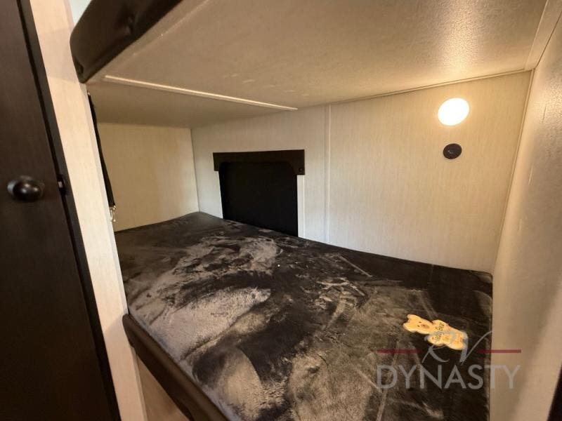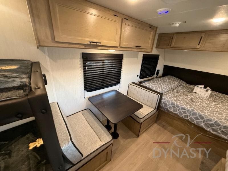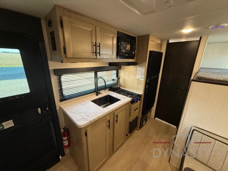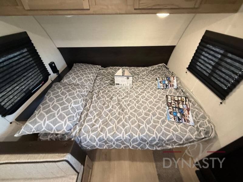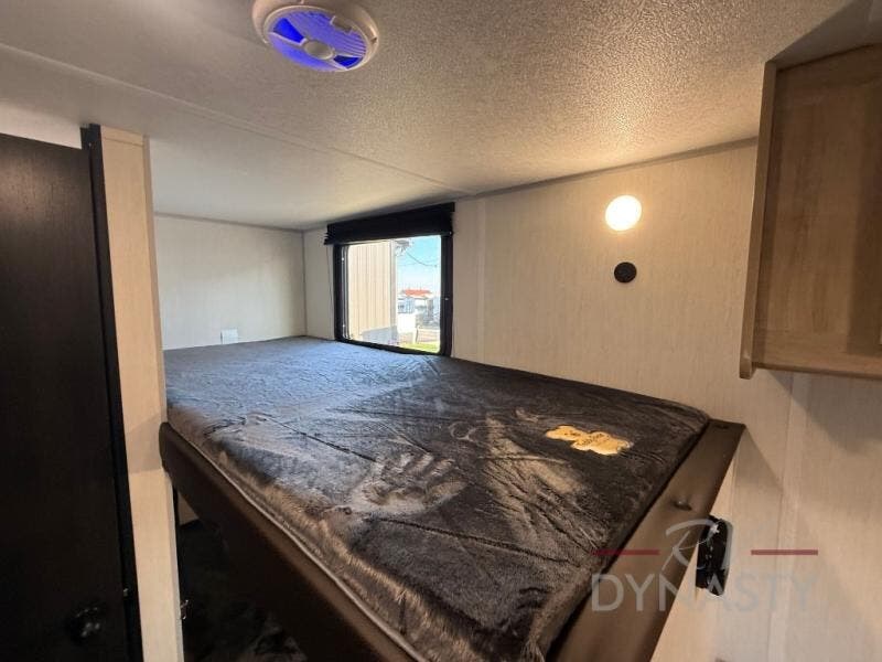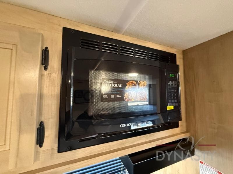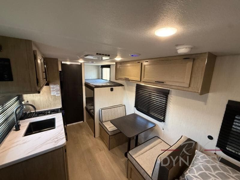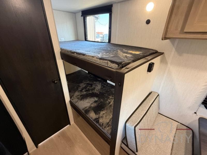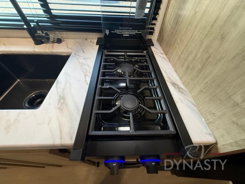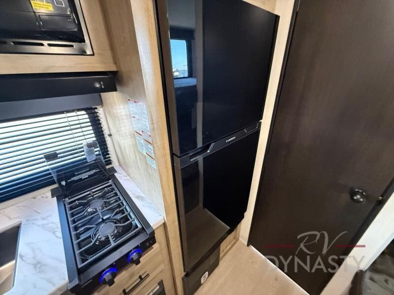 The whole family can sleep comfortably in this travel trailer! It has a set of bunk beds for the kids to sleep on, and you can sleep comfortably on the front queen bed with overhead cabinets and a shelf. There is even an exterior storage plus door that accesses the storage space under the bottom bunk. The chef will enjoy preparing their best home cooked meals either indoors with the high output cooktop or at the outside mini kitchen while staying protected by the 12' power awning!