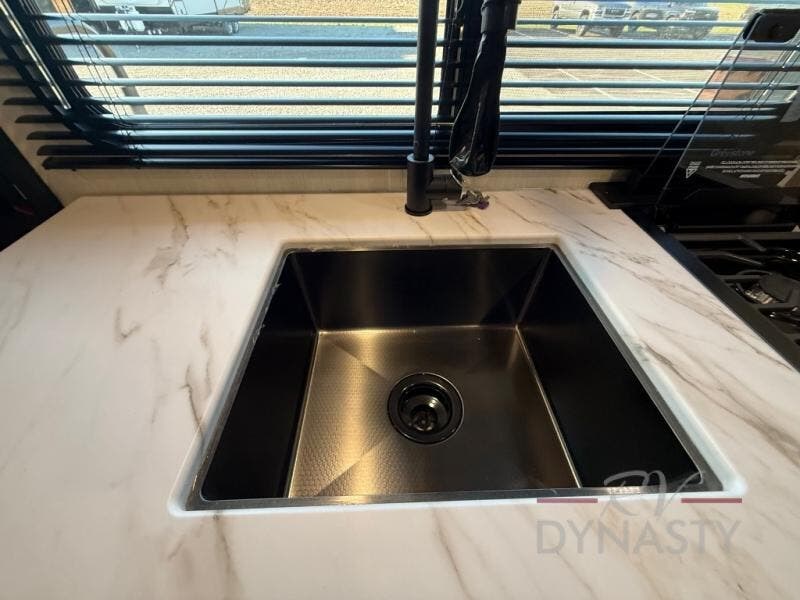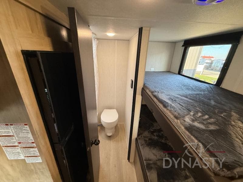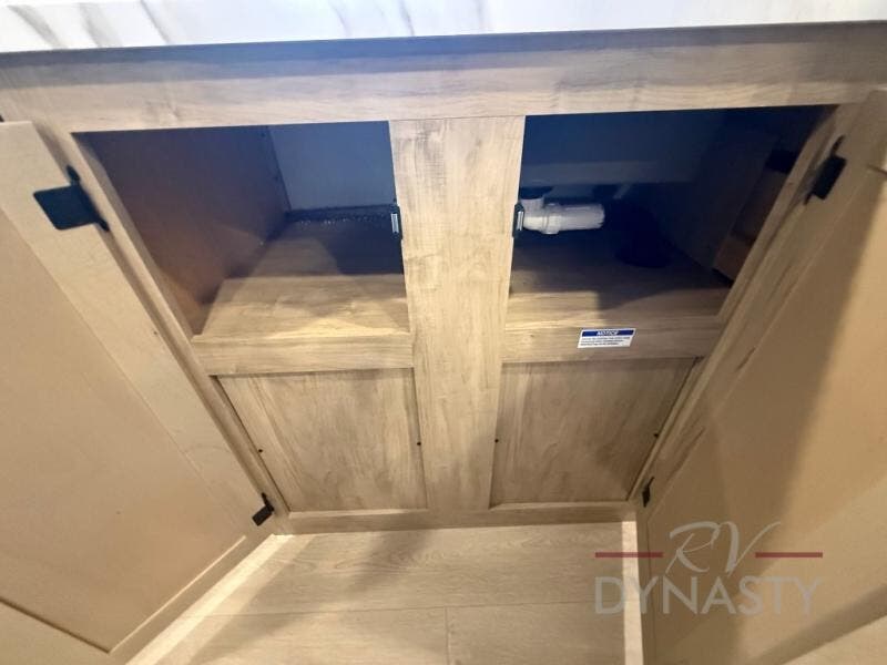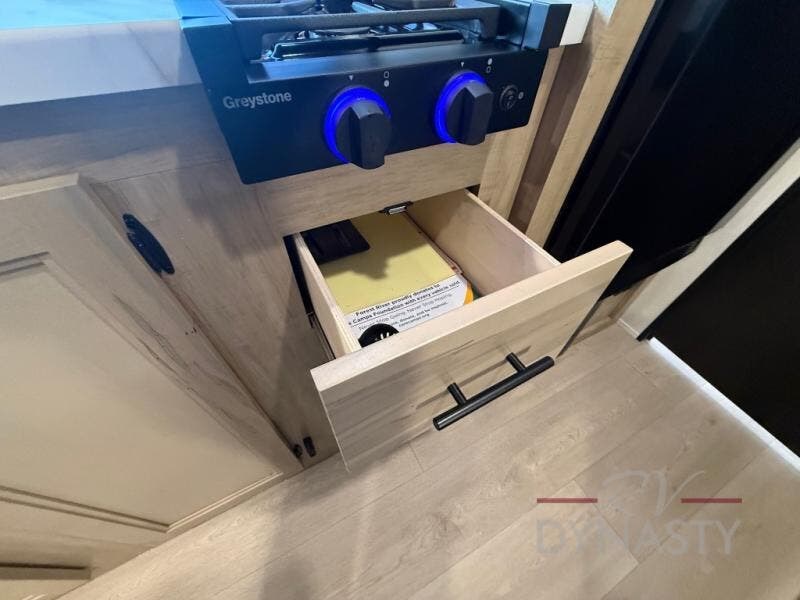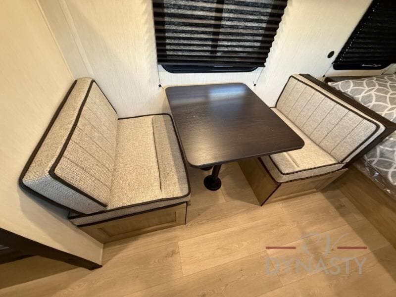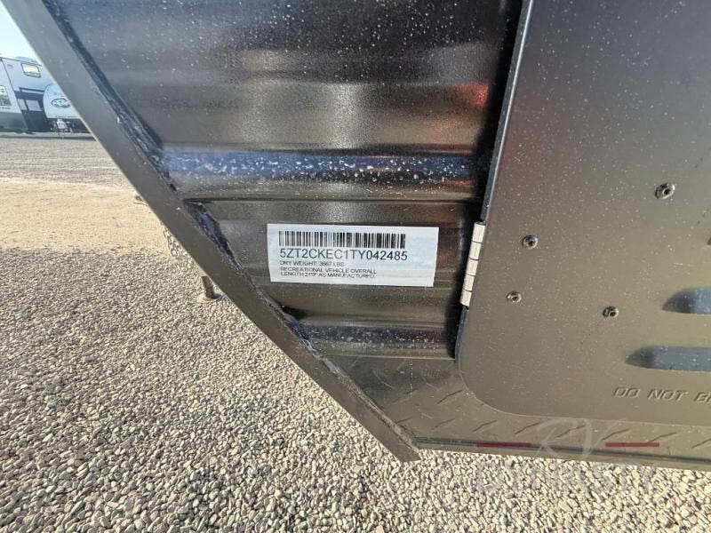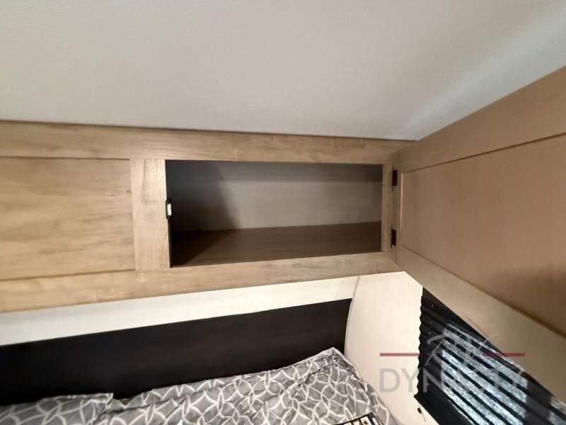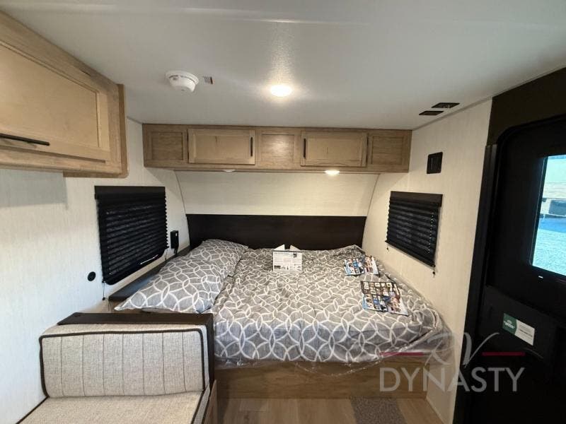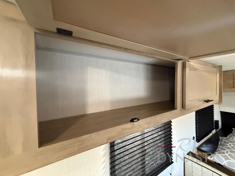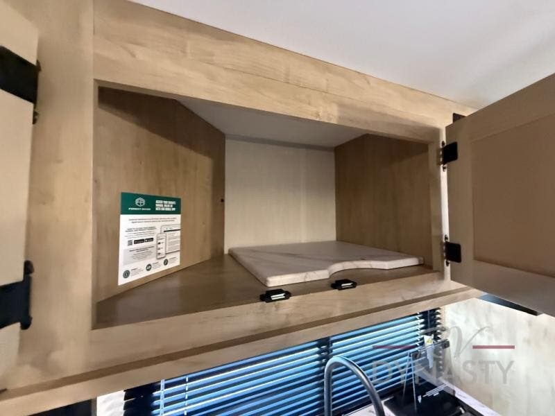 The whole family can sleep comfortably in this travel trailer! It has a set of bunk beds for the kids to sleep on, and you can sleep comfortably on the front queen bed with overhead cabinets and a shelf. There is even an exterior storage plus door that accesses the storage space under the bottom bunk. The chef will enjoy preparing their best home cooked meals either indoors with the high output cooktop or at the outside mini kitchen while staying protected by the 12' power awning!