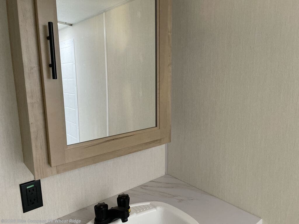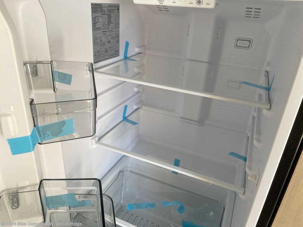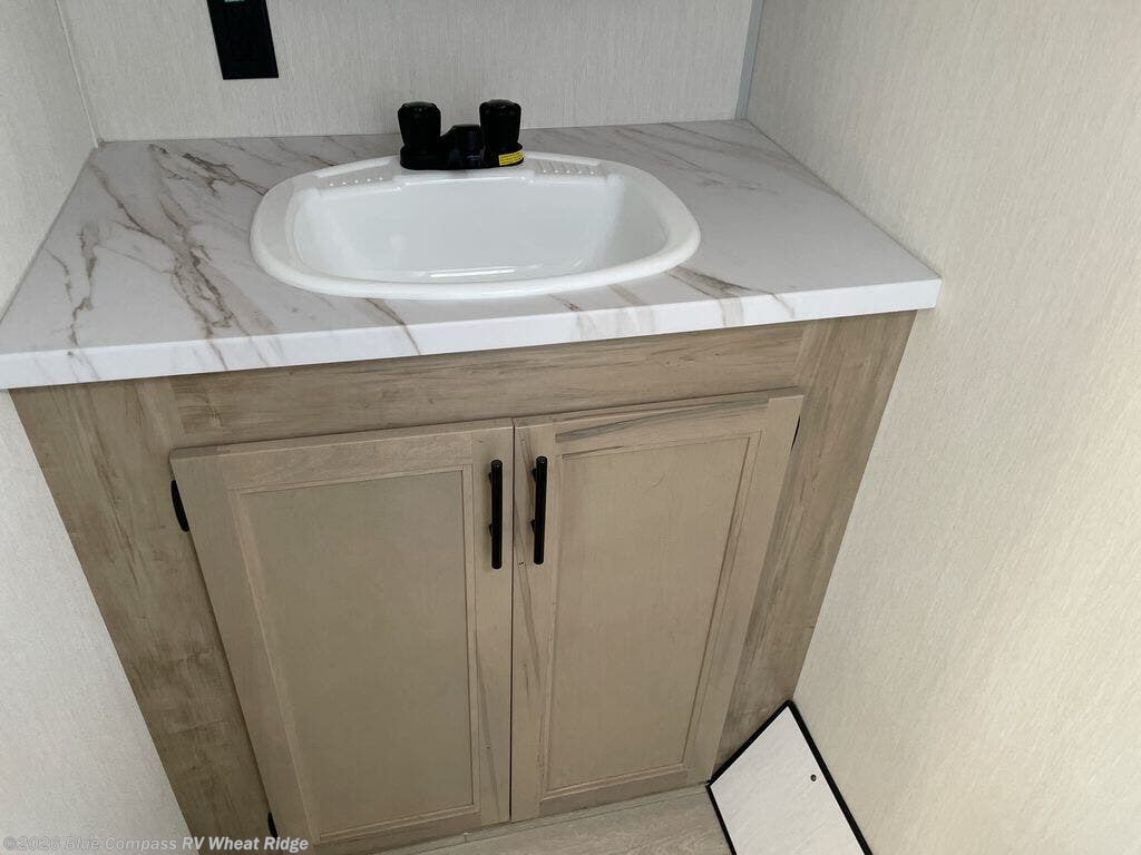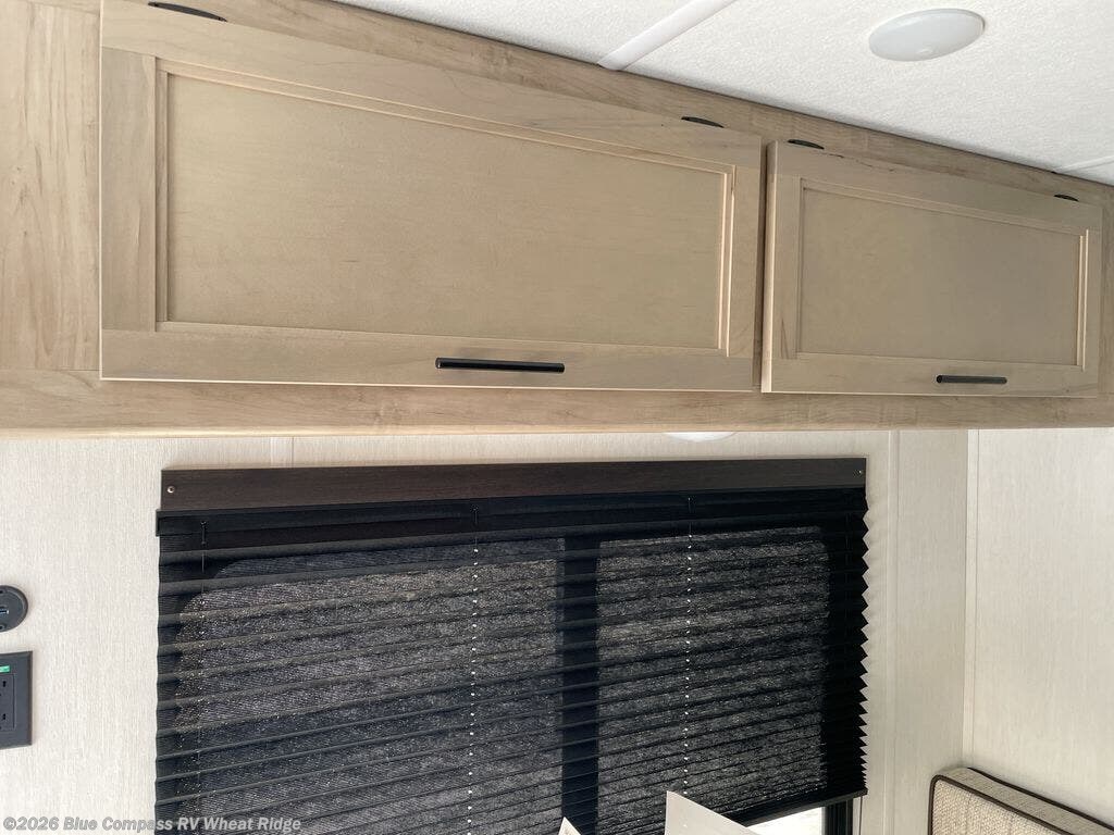 The 16FQ features a huge queen bed in a compact single axle form factor. A large kitchen boasting a flush mount glass cook top, huge sink, ample counter space, and 10.3 cu.ft. double door refrigerator. The rear bathroom showcases a large sink area with cabinet storage below. Exterior features include a full size power awning, outside mini kitchen, MORryde stable step, RVQ quick connect system, standard coach stabilizing system, and LED lighting.