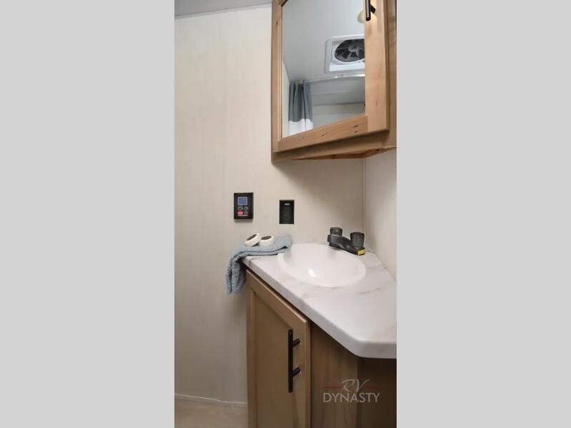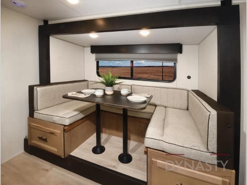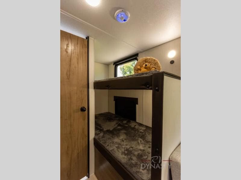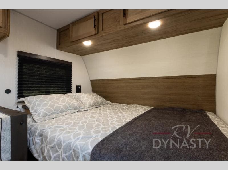 The whole family can sleep comfortably in this travel trailer! It has a set of bunk beds for the kids to sleep on, and you can sleep comfortably on the front queen bed with overhead cabinets and a shelf. The chef will enjoy preparing their best home cooked meals with the high output cooktop, and you can dine at the booth dinette. And the private bath onboard means you won't have to leave your camper in the middle of the night!