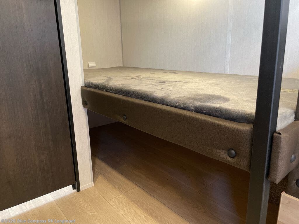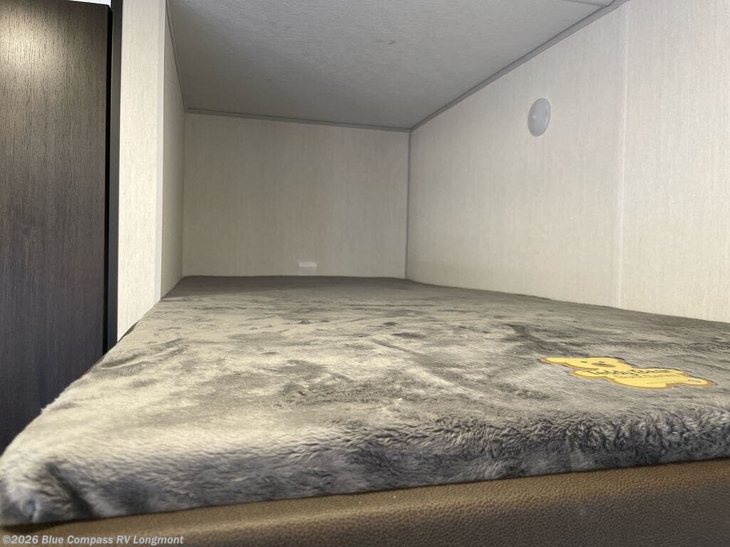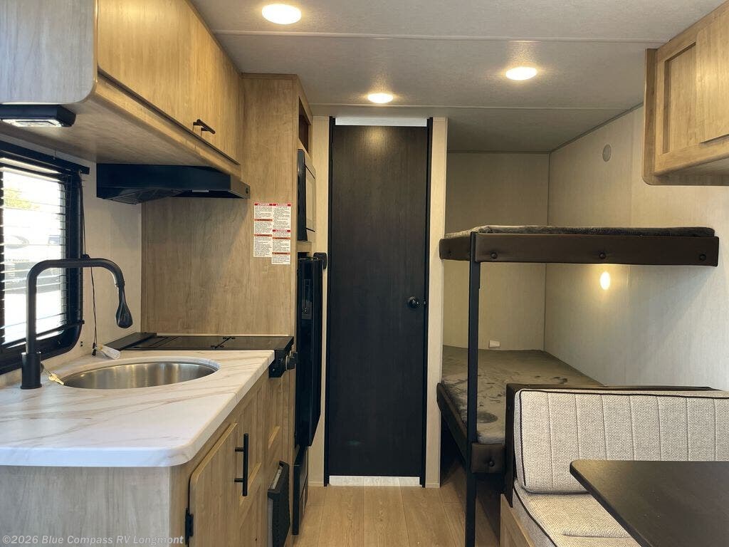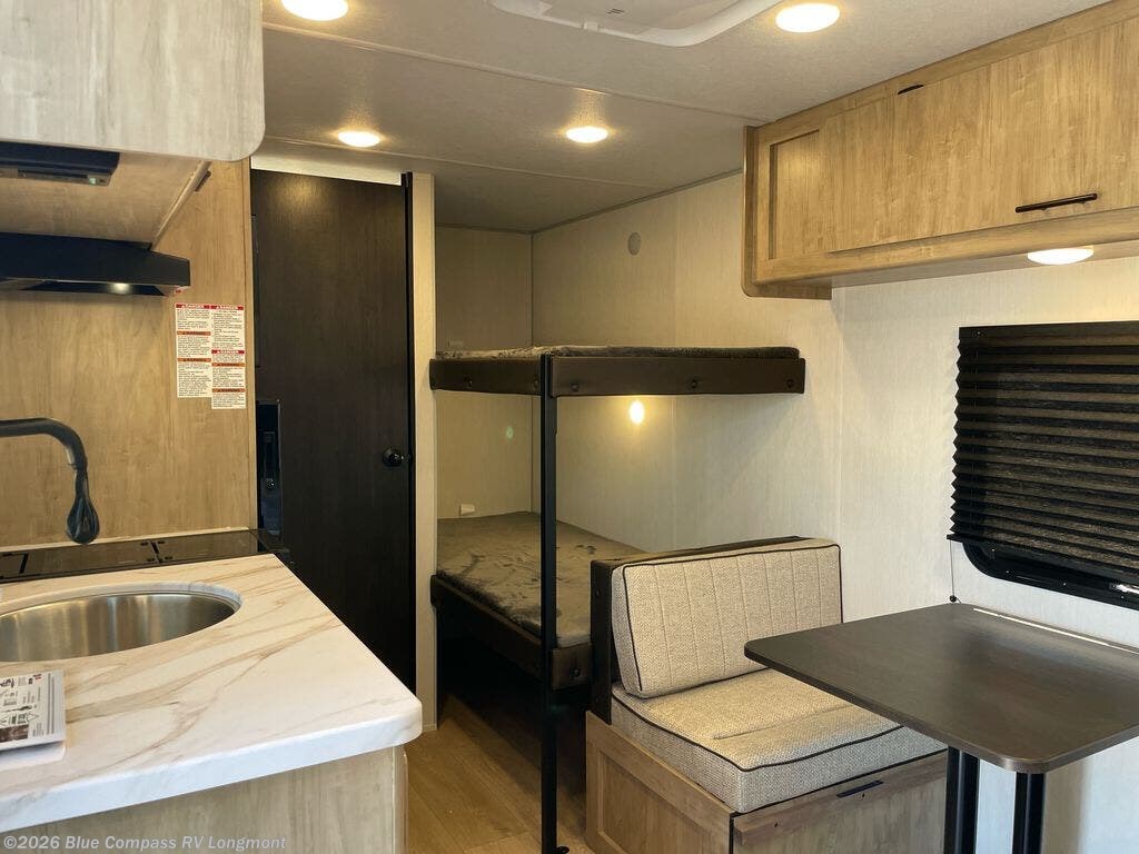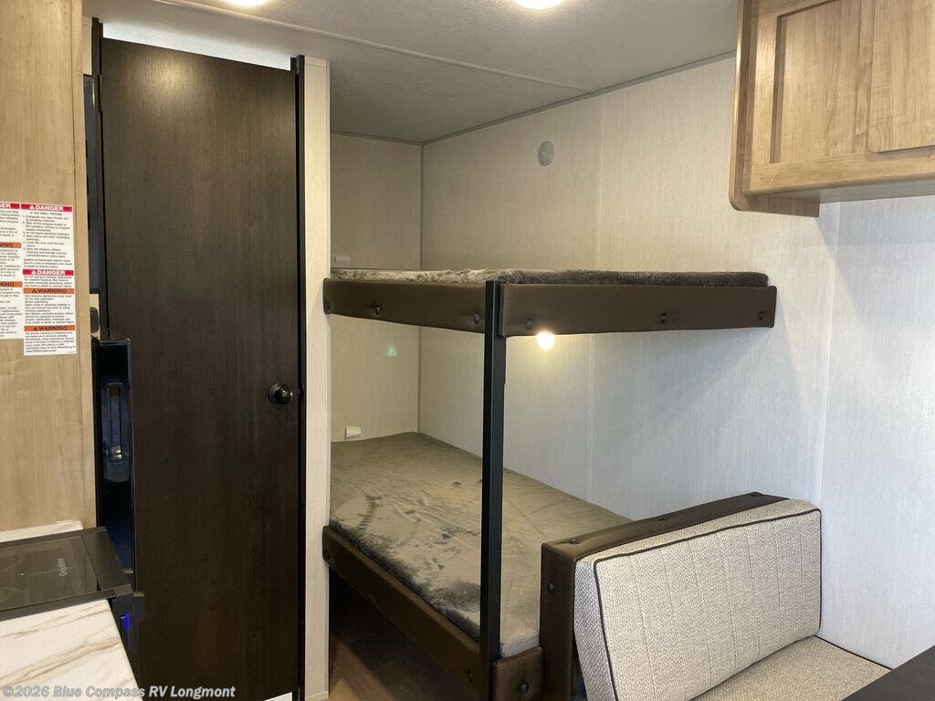 The whole family can sleep comfortably in this travel trailer! It has a set of bunk beds for the kids to sleep on, and you can sleep comfortably on the front queen bed with overhead cabinets and a shelf. The chef will enjoy preparing their best home cooked meals with the high output cooktop, and you can dine at the booth dinette. And the private bath onboard means you won't have to leave your camper in the middle of the night!