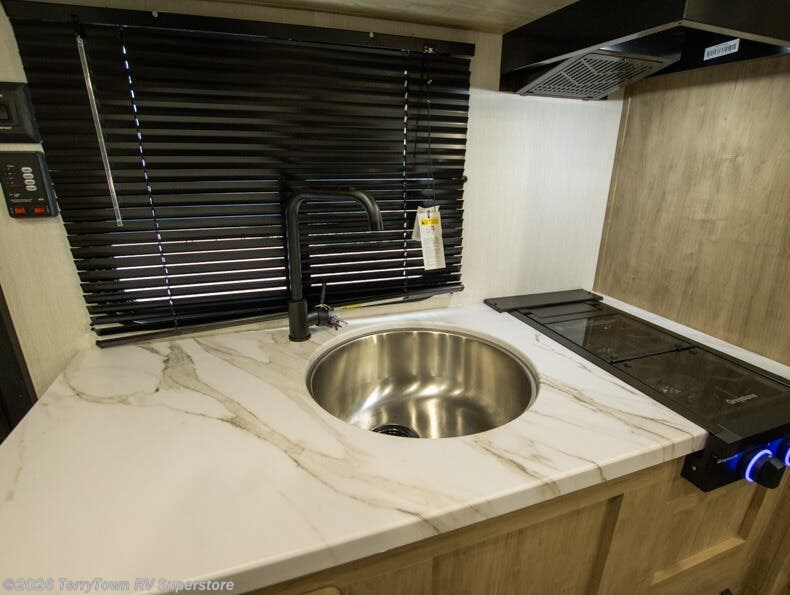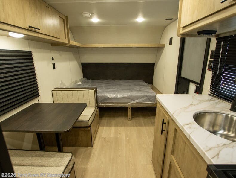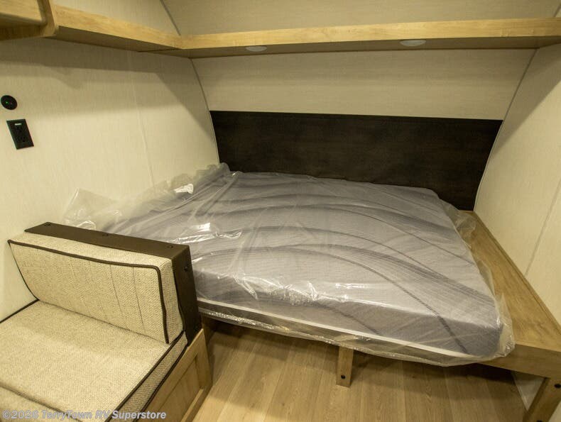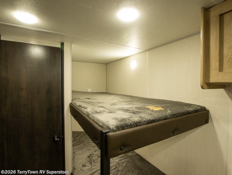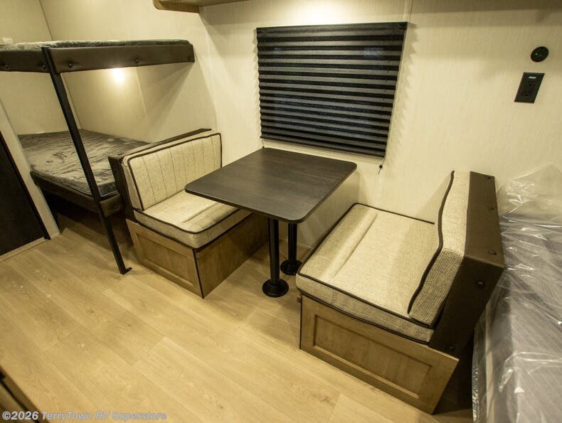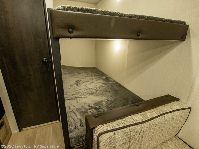 The whole family can sleep comfortably in this travel trailer! It has a set of bunk beds for the kids to sleep on, and you can sleep comfortably on the front queen bed with overhead cabinets and a shelf. The chef will enjoy preparing their best home cooked meals with the cooktop, and you can dine at the booth dinette. And the private bath onboard means you won't have to leave your camper in the middle of the night!