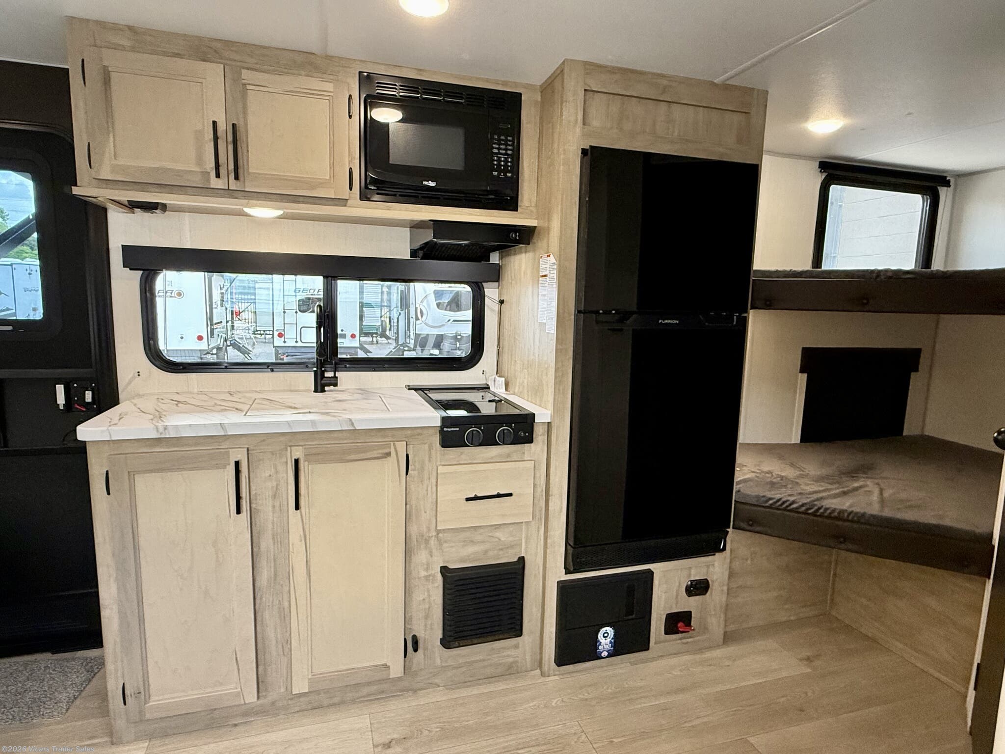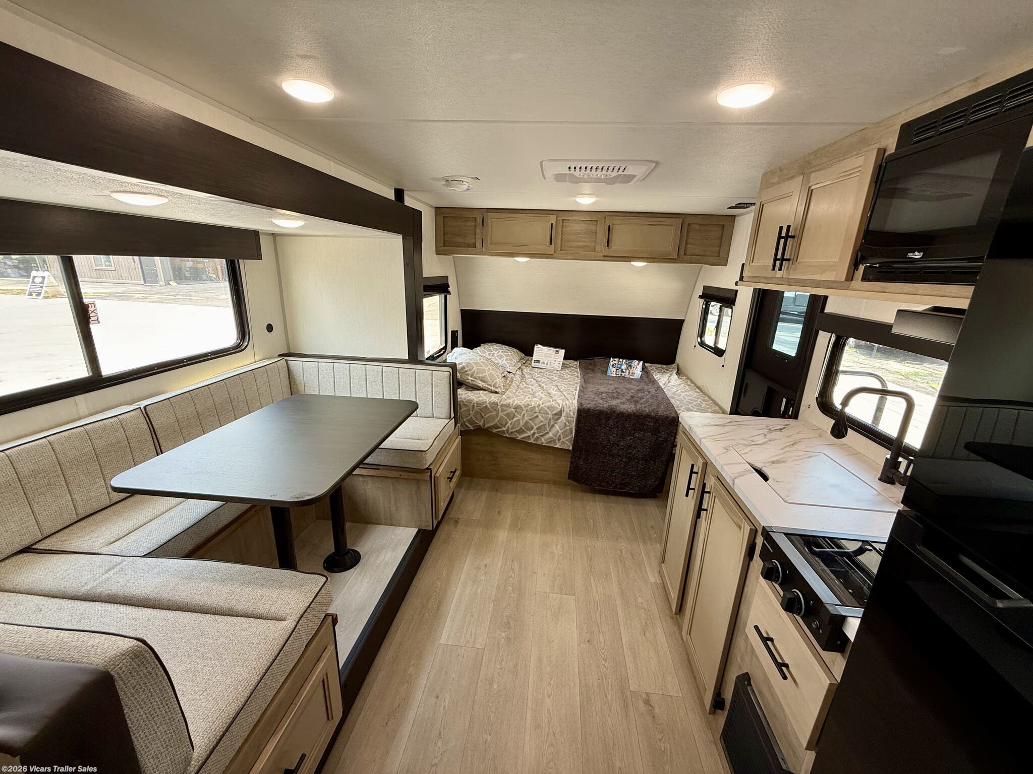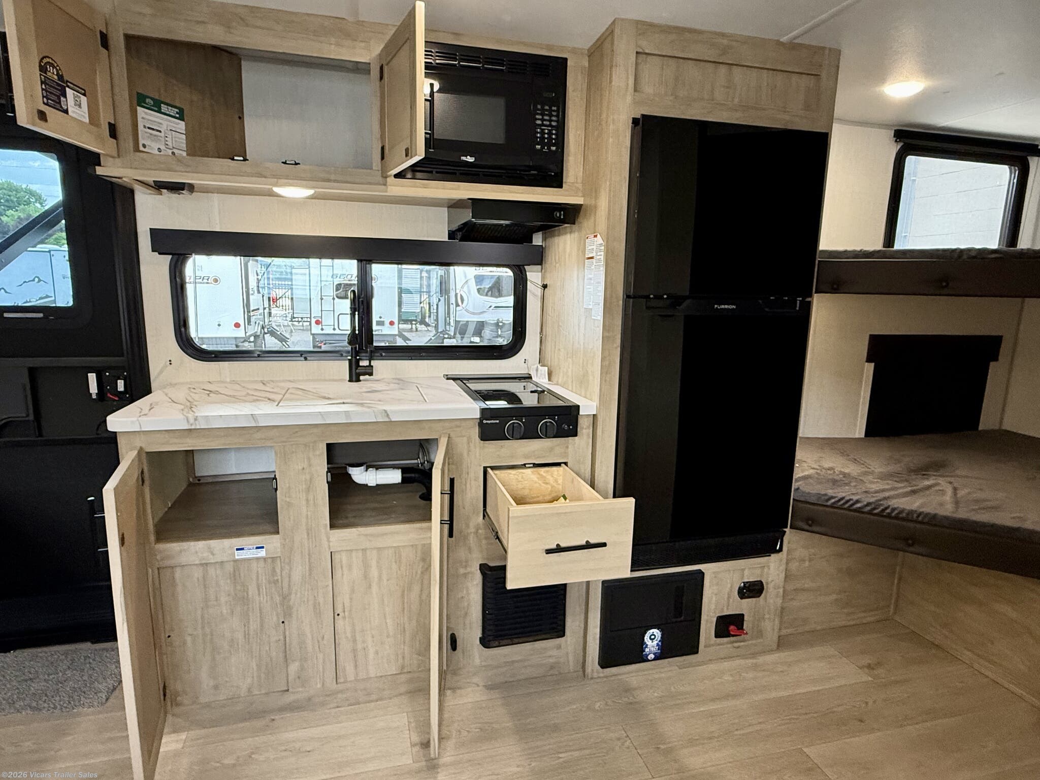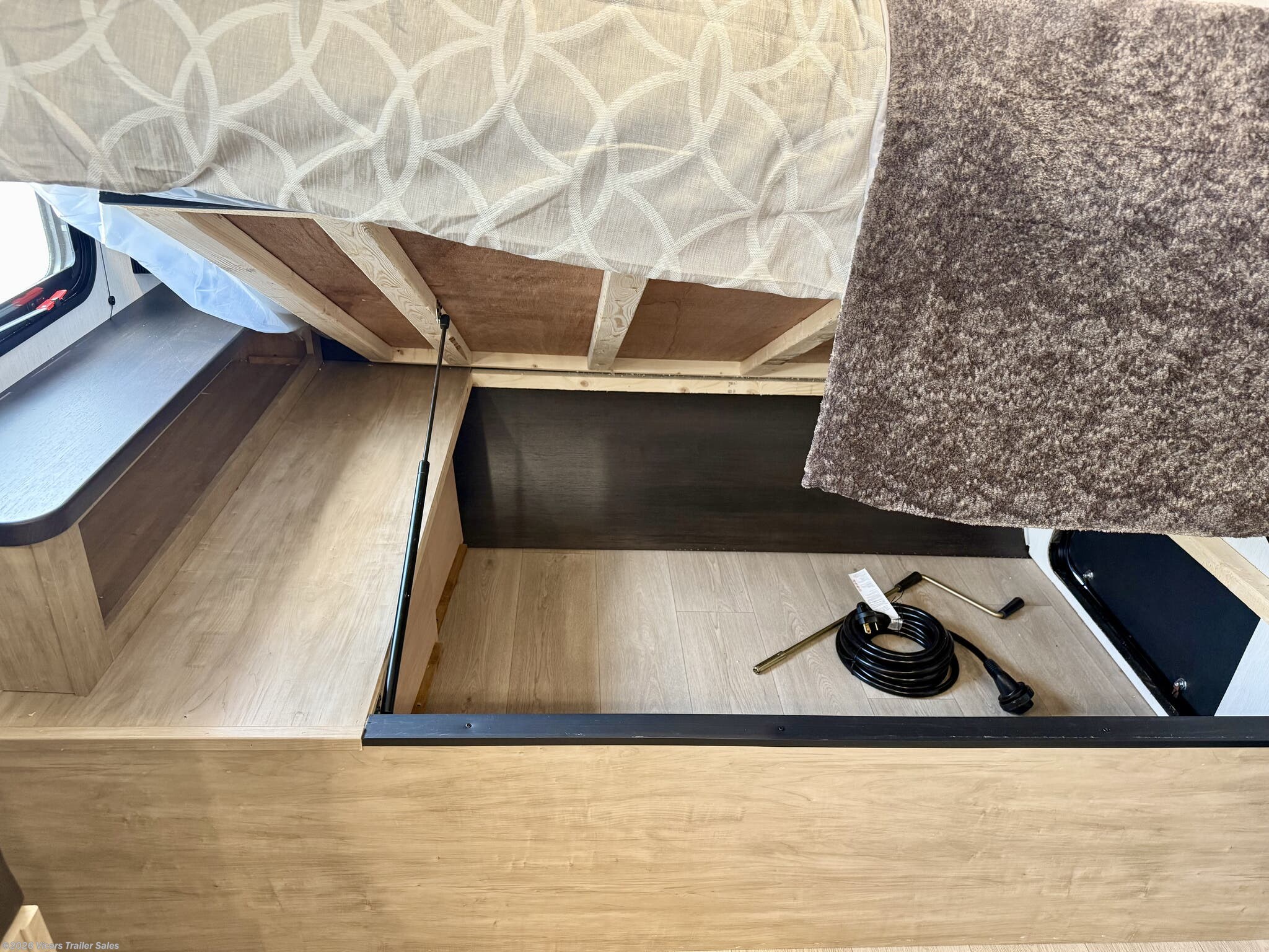 - Conveniences like a water heater, converter, LP detector, smoke and CO detectors, and fire extinguisher for safety