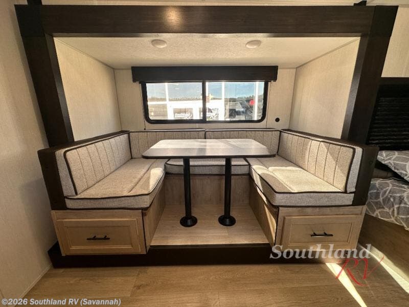 This family travel trailer is ready to head to the campground whenever you are! The kiddos can sleep on the set of double-size bed bunks, and you can sleep on the front queen bed, plus the U-shaped dinette slide can also transform into an extra sleeping space when you aren't using it to enjoy a meal prepared with the cooktop. You can also prepare your delicious meals at the outside mini kitchen and stay protected by the power awning. The exterior not only has outside storage and an outside TV mount but also features an outside storage plus door for access to the storage space underneath the bottom bunk bed. The rear corner bath allows everyone to stay clean and refreshed while you camp.