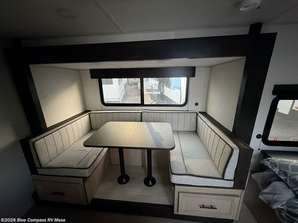 This family travel trailer is ready to head to the campground whenever you are! The kiddos can sleep on the set of double-size bed bunks, and you can sleep on the front queen bed, plus the U-shaped dinette slide can also transform into an extra sleeping space when you aren't using it to enjoy a meal prepared with the cooktop. You can also prepare your delicious meals at the outside mini kitchen and stay protected by the power awning. The exterior not only has outside storage and an outside TV mount but also features an outside storage plus door for access to the storage space underneath the bottom bunk bed. The rear corner bath allows everyone to stay clean and refreshed while you camp.
