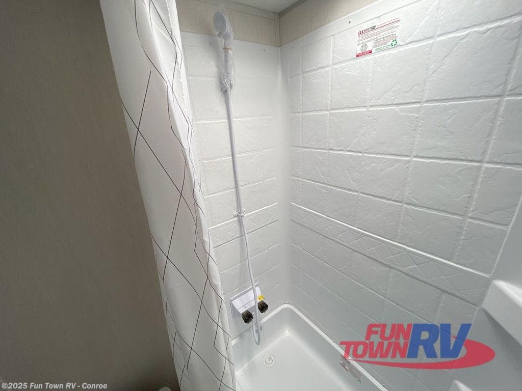 This family travel trailer is ready to head to the campground whenever you are! The kiddos can sleep on the set of double-size bed bunks and you can sleep on the front queen bed, plus the U-shaped dinette slide can also transform into an extra sleeping space when you aren't using it to enjoy a meal prepared with the high output cooktop. You can also prepare your delicious meals at the outside mini kitchen and stay protected by the power awning. The exterior not only has outside storage and an outside TV mount, but also features an outside storage plus door for access to the storage space underneath the bottom bunk bed. The rear corner bath allows everyone to stay clean and refreshed while you camp.