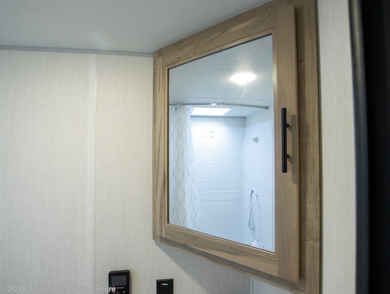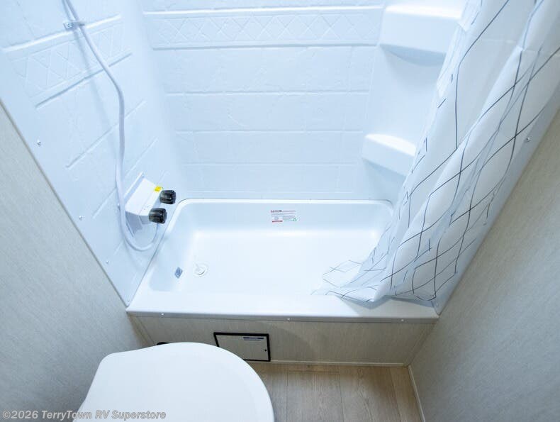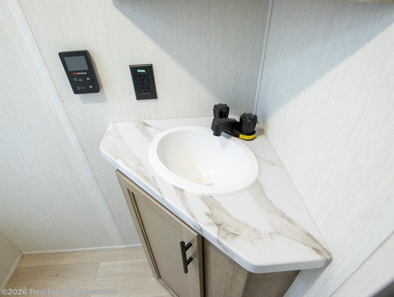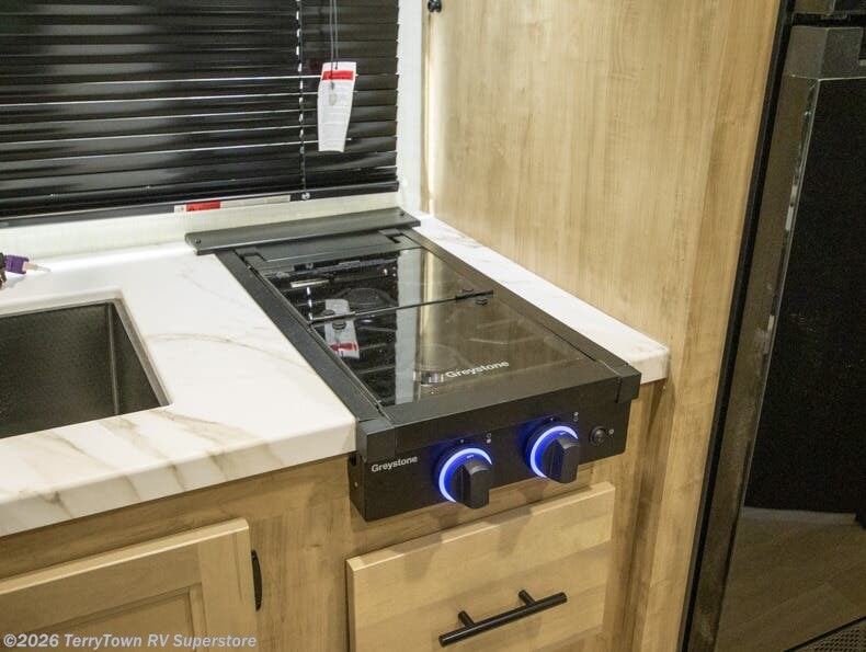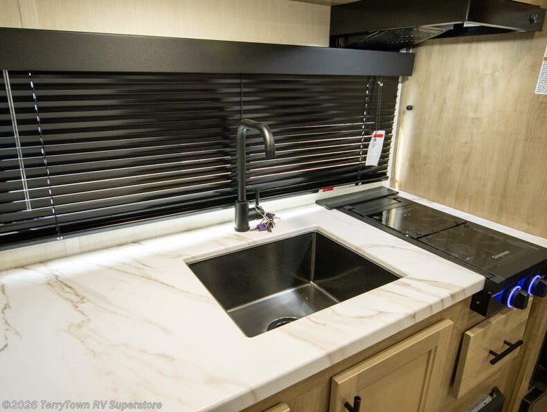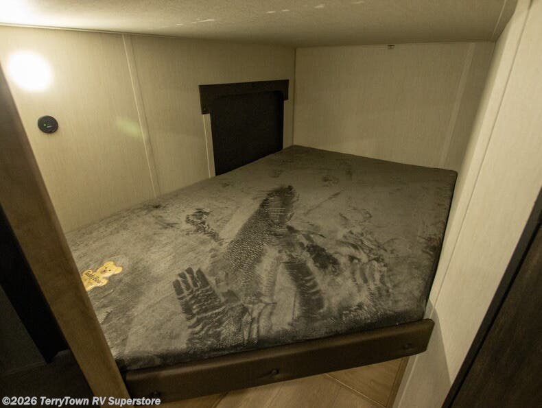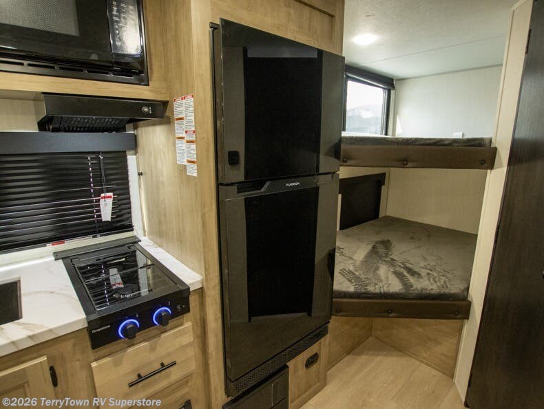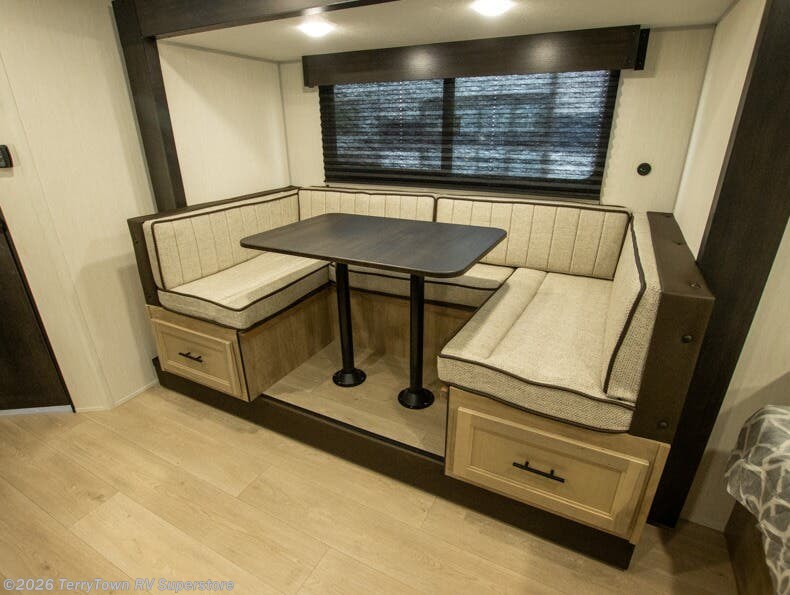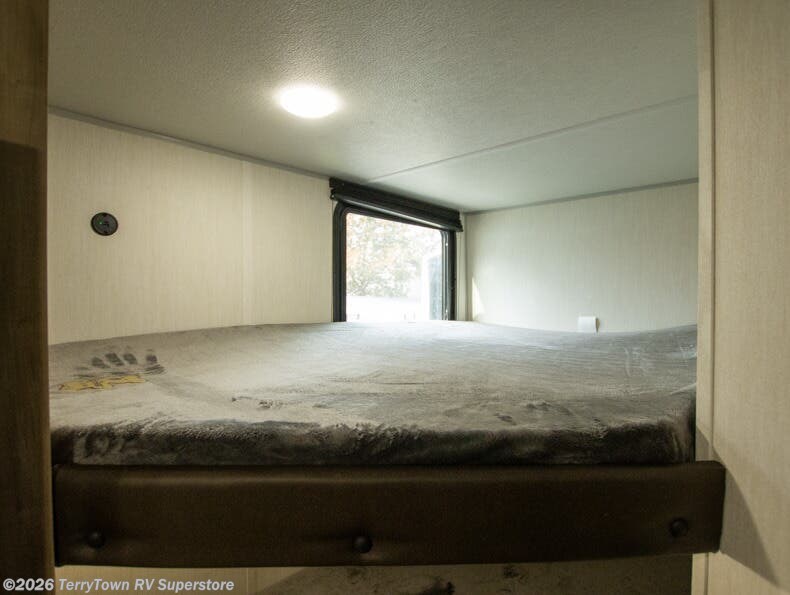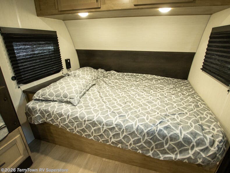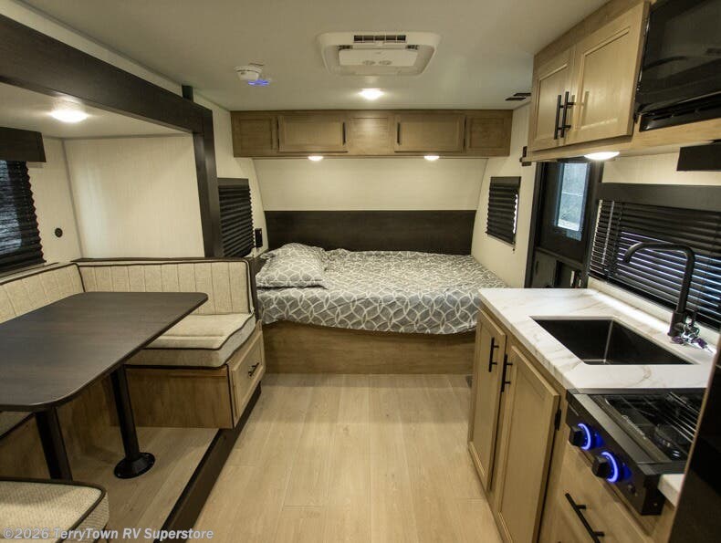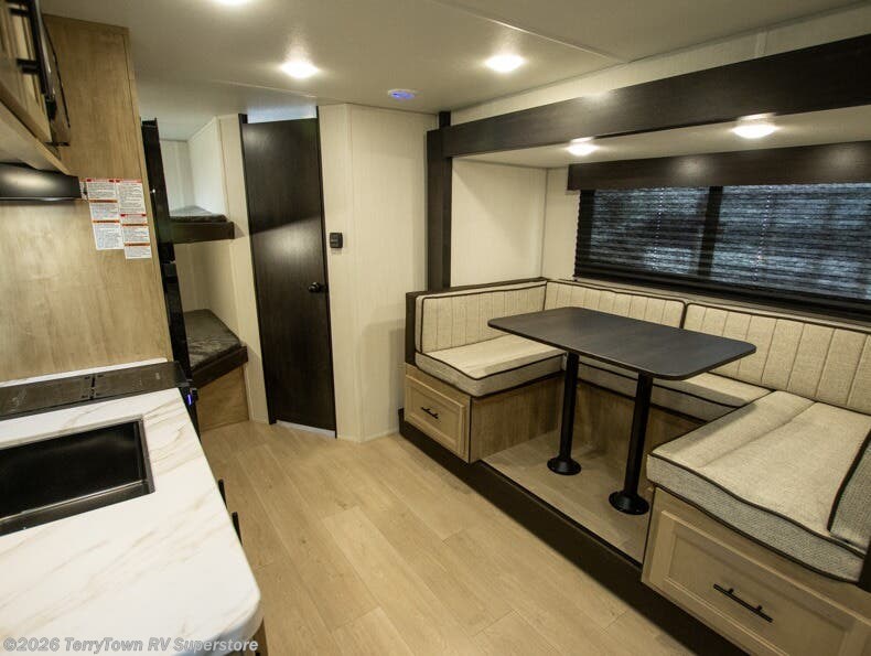 This family travel trailer is ready to head to the campground whenever you are! The kiddos can sleep on the set of double-size bed bunks, and you can sleep on the front queen bed, plus the U-shaped dinette slide can also transform into an extra sleeping space when you aren't using it to enjoy a meal prepared with the cooktop. You can also prepare your delicious meals at the outside mini kitchen and stay protected by the power awning. The exterior not only has outside storage and an outside TV mount but also features an outside storage plus door for access to the storage space underneath the bottom bunk bed. The rear corner bath allows everyone to stay clean and refreshed while you camp.