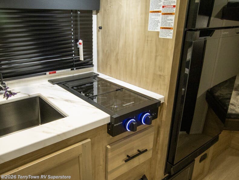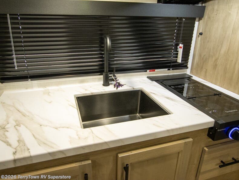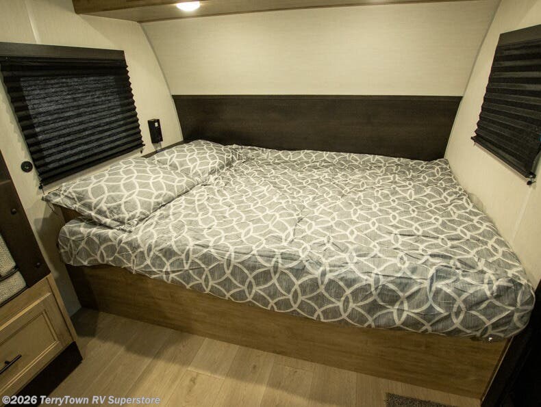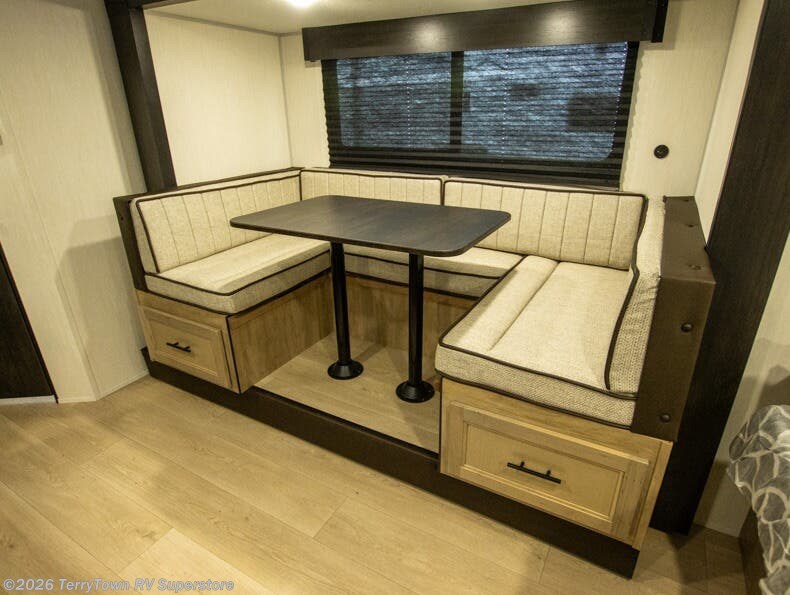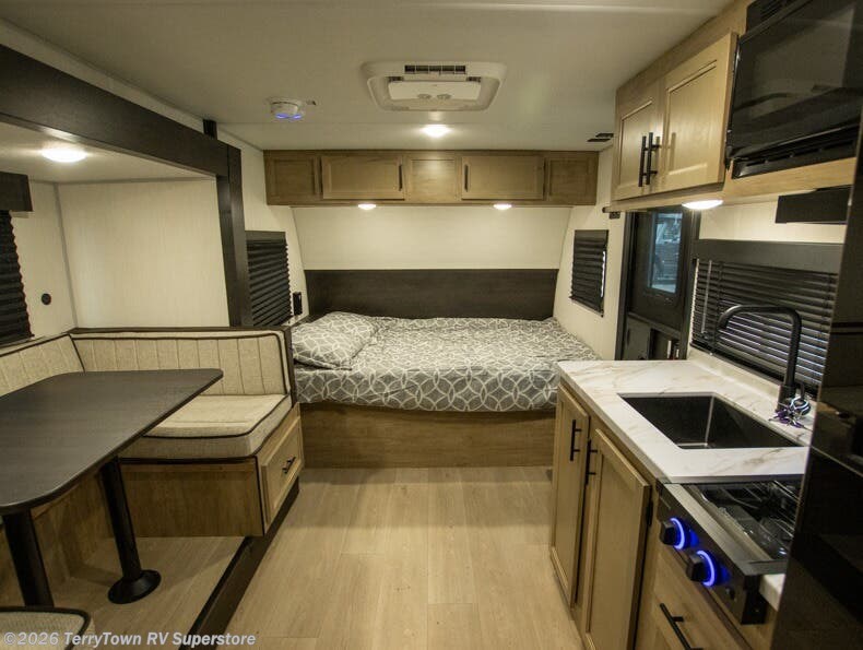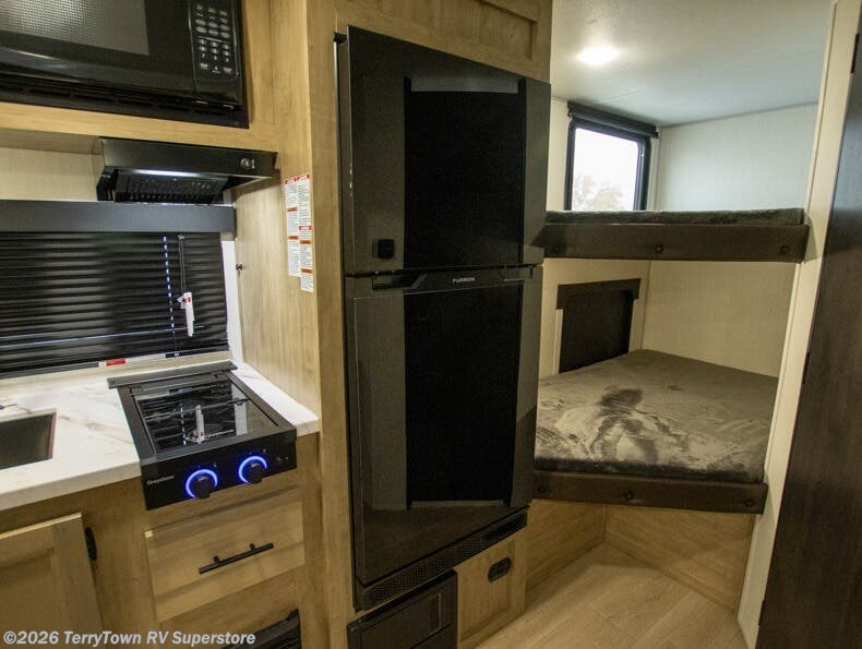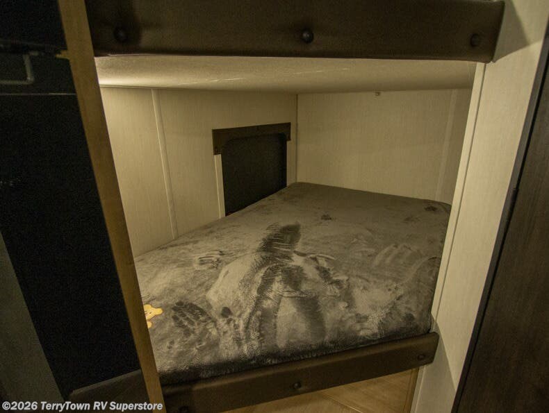 This family travel trailer is ready to head to the campground whenever you are! The kiddos can sleep on the set of double-size bed bunks, and you can sleep on the front queen bed, plus the U-shaped dinette slide can also transform into an extra sleeping space when you aren't using it to enjoy a meal prepared with the cooktop. You can also prepare your delicious meals at the outside mini kitchen and stay protected by the power awning. The exterior not only has outside storage and an outside TV mount but also features an outside storage plus door for access to the storage space underneath the bottom bunk bed. The rear corner bath allows everyone to stay clean and refreshed while you camp.